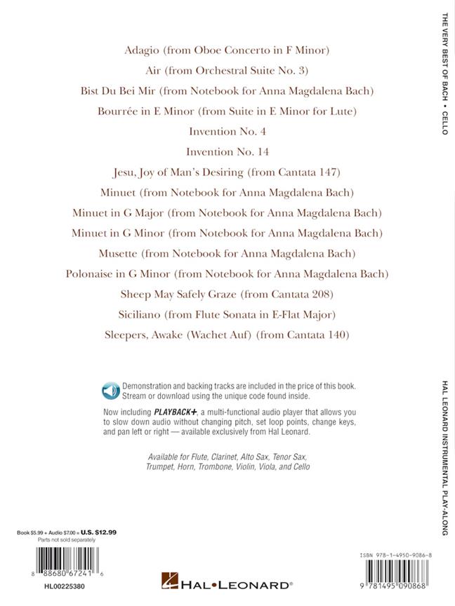 15 selections of some of J.S. Bach's most treasured compositions in accessible arrangements for budding instrumentalists with online demo and backing tracks for download or streaming with the popular Playback + features allowing the player to adjust pitch, change keys, slow down audio, and more. Pieces include Adagio, Bist Du Bei Mir, Bourrée in E Minor, Jesu, Joy of Man's Desiring, Minuet in G Major, Polonaise in G Minor, Sheep May Safely Graze, Sleepers, Awake (Wachet Auf) and more.