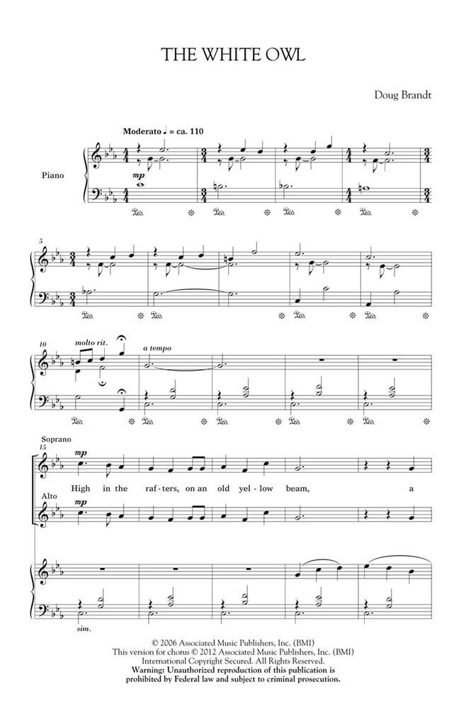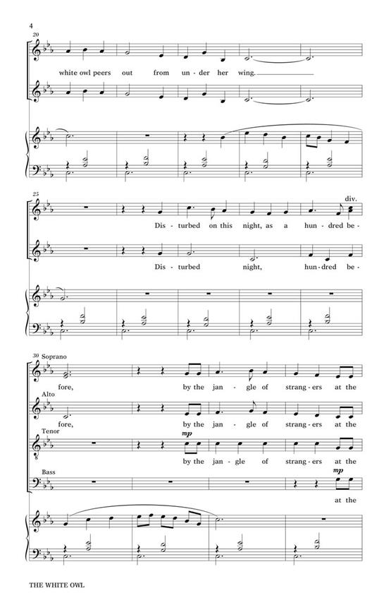 Ce travail reflète le drame silencieux de la Nativité, telle que vue par une chouette effraie blanc - un sauvage, observateur désintéressé, un chasseur de nuit qui est à la fois pas au courant de l'importance de l'événement et pourtant proche de son mystère. La tonalité mineure et de balayage 3/4 mètres se combinent pour créer une qualité mystique qui fournira un nouveau changement de rythme dans votre programmation de Noël.