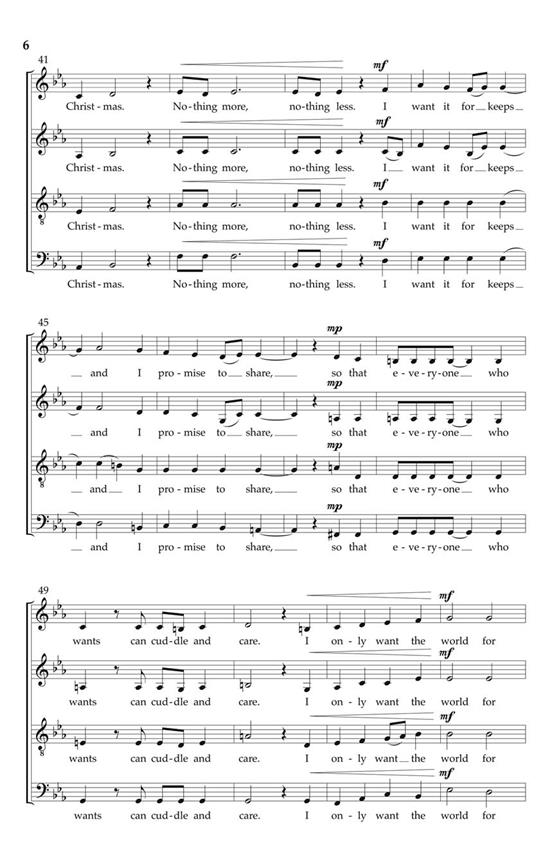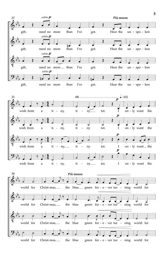 Le morceau-titre du dernier CD sorti par The Real Group, cette chanson intemporelle pour toutes les saisons du compositeur de TRG de Chili Con Carne et Bumble Bee, porte un vœu sincère pour notre monde à venir. Fusionnant jazz vocal léger avec des touches de choral et de musique folklorique, ce cadre strictement SATB avec une partie de piano optionnelle est largement accessible pour le lycée et au-delà. Partie de piano optionnelle (partition complète) disponible séparément. Durée : environ 4h30.
