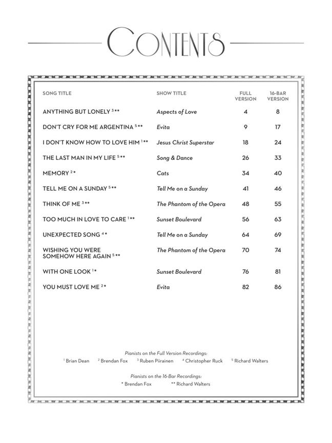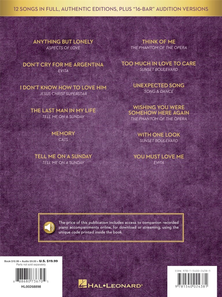 A dozen of Andrew Lloyd Webber's most memorable musical theatre compositions for women's voices. The book includes full versions and 16-bar audition cuts for each song, and recorded accompaniments for both versions available online for download or streaming.