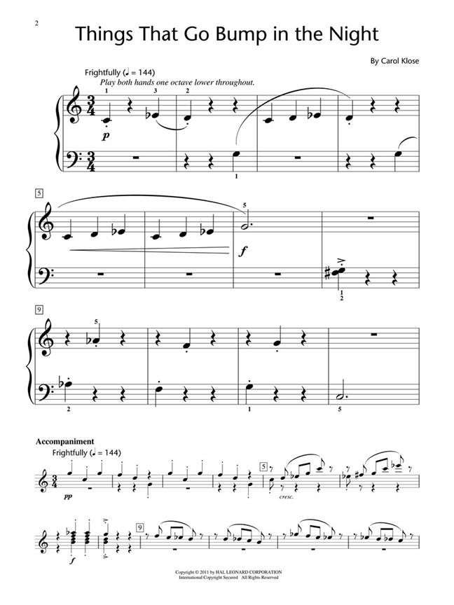 Écrite en comptés 3/4, cette petite valse effrayante n’est pas seulement amusante à jouer, mais elle regorge aussi de bons éléments pédagogiques, notamment des altérations faciles, des cresc., des atténuations, des insultes, des accents, des staccato et bien plus encore ! Comprend un duo de professeurs pour un récital encore plus dramatique.