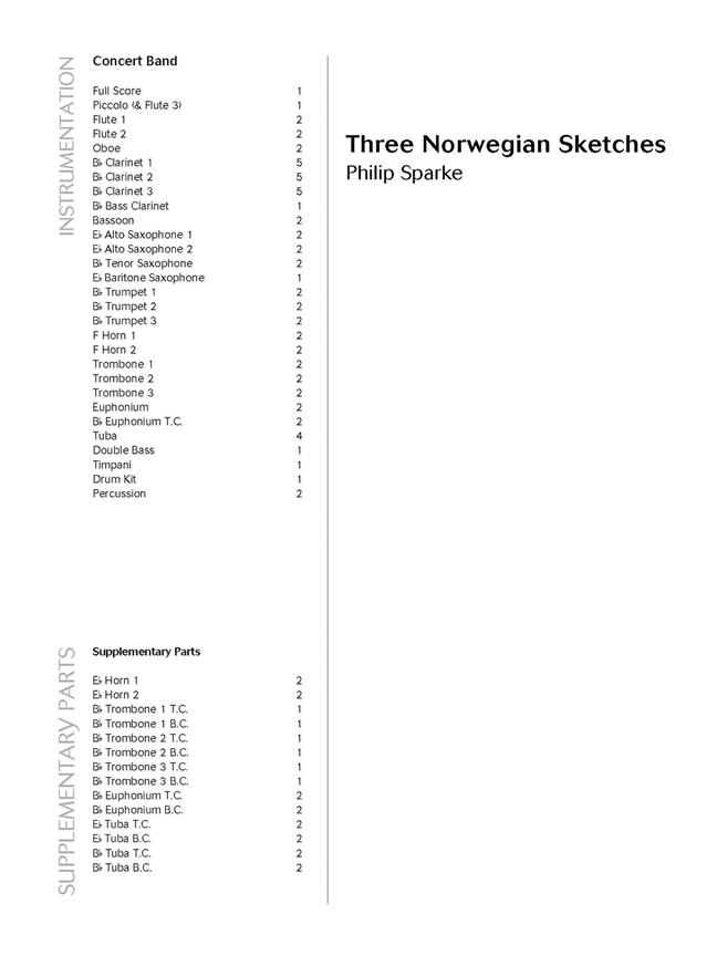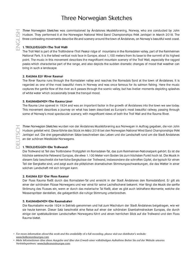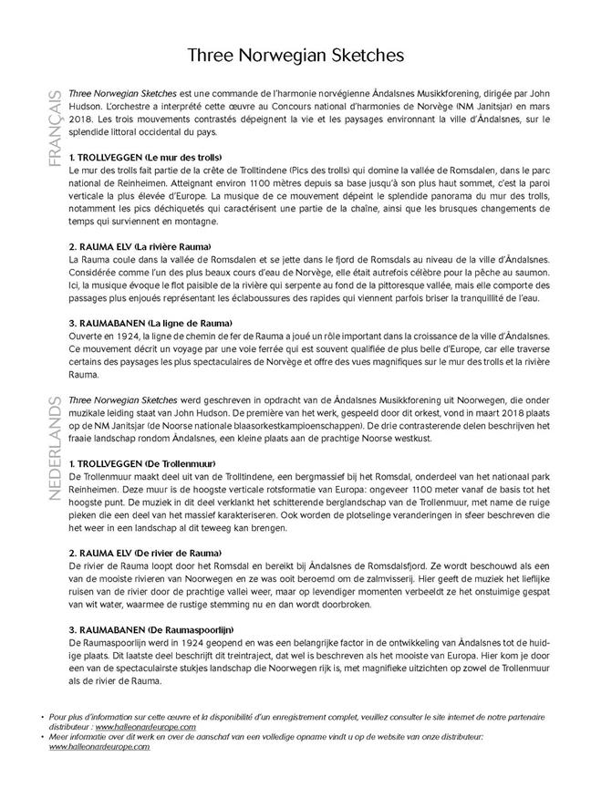 Three Norwegian Sketches est une commande de l’harmonie norvégienne Åndalsnes Musikkforening, dirigée par John Hudson. Ses trois mouvements contrastés «Trollveggen» (Le mur des trolls), «Rauma Elv» (La rivière Rauma) et «Raumabanen» (La ligne Rauma) dépeignent la vie et les paysages environnant la ville d’Åndalsnes, sur le splendide littoral occidental du pays. Stimulante, originale et adaptable, cette nouvelle pièce est idéale pour un concert où un concours.