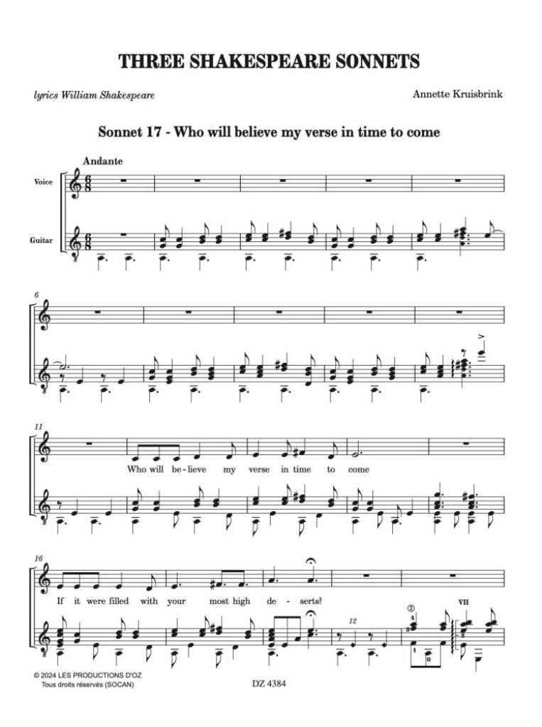 William Shakespeare (1564–1616) est considéré comme le plus grand écrivain jamais produit par l’Angleterre. Il écrivit 154 sonnets. Pour ses « Trois Sonnets de Shakespeare », Annette Kruisbrink a choisi les numéros 17, 40 et 66, les mettant en musique pour voix et guitare.