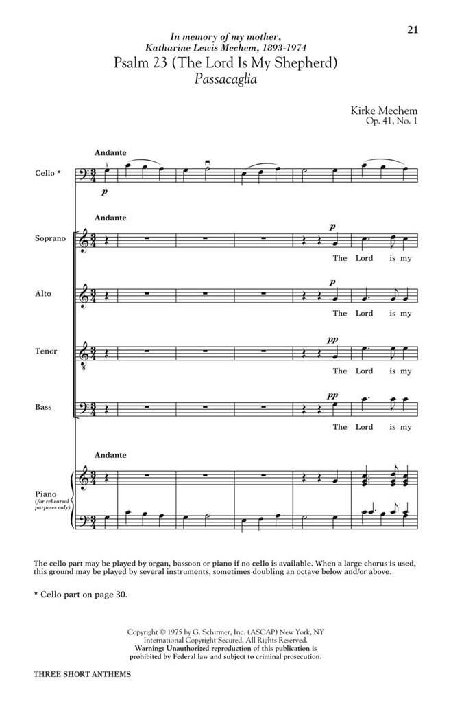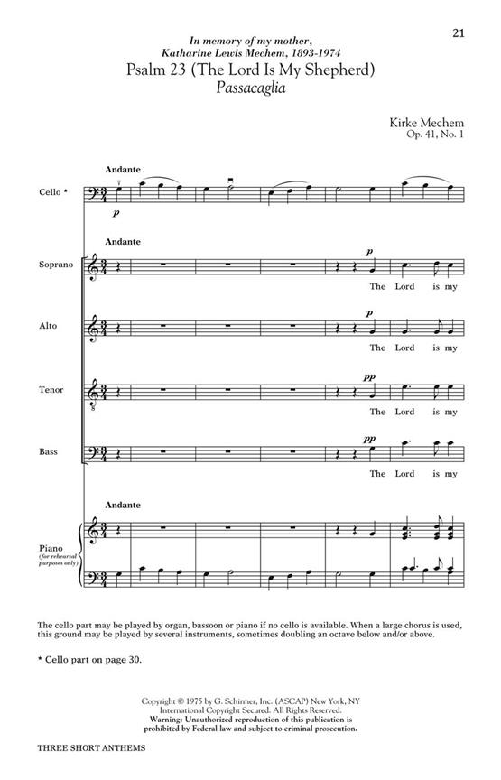 Les œuvres chorales de Kirke Mechem reflètent constamment sa capacité à créer des expériences mémorables, significatives et artistiques pour les interprètes et le public. Le premier du coffret, « I Will Sing Alleluia », est écrit pour voix mixtes, piano, flûte, triangle et blocs de temple. « Il est bon de remercier » est pour voix à l’unisson et piano ou orgue, et le troisième, « Psaume 23 », est pour voix mixtes a cappella avec une basse fondamentale (violoncelle, basson ou orgue).