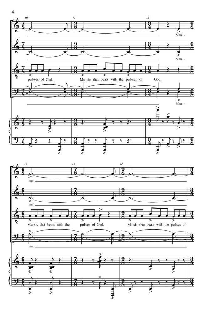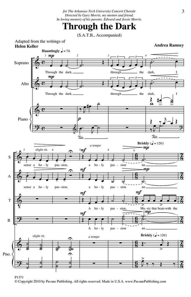 Adapté des écrits d’Helen Keller, Andrea Ramsey a dessiné un merveilleux espoir pour le Concert Chorale de l’Université Arkansas Tech. Décrire le texte en musique va de passages sombres et obsédants à des éveils rythmiquement vibrants de compréhension et de lumière. Bien qu’il soit destiné aux salles de concert des chorales de lycée et d’université, un bon chœur d’église le trouverait également adapté au culte.
