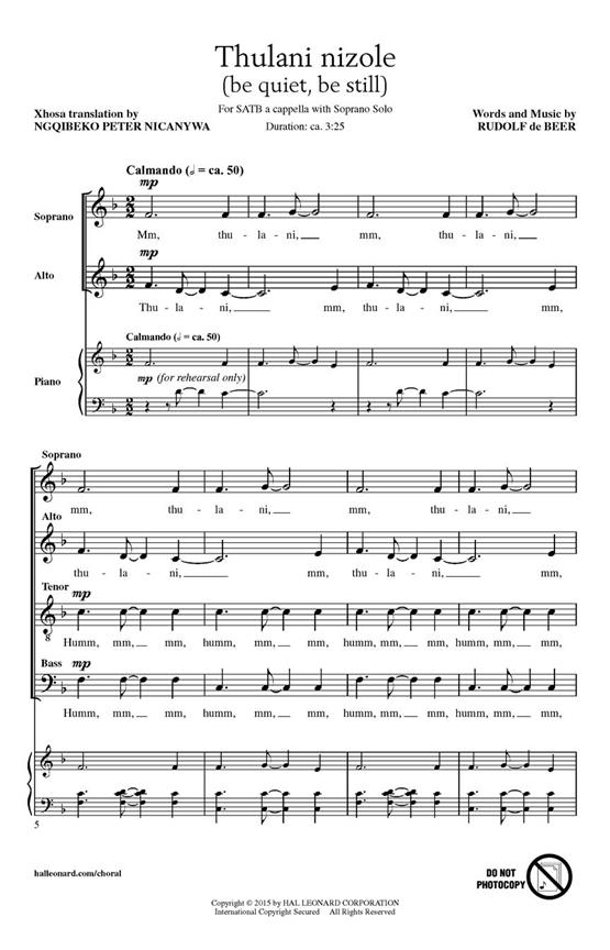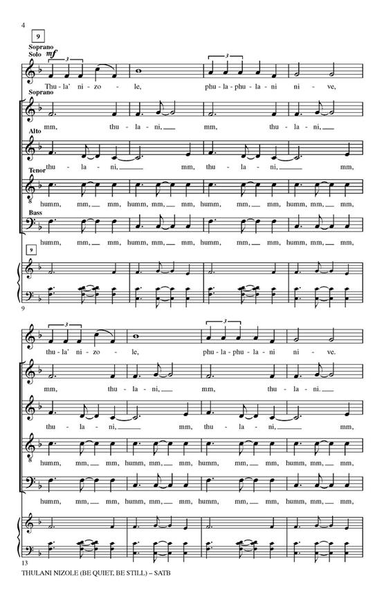 Be quiet, be still, listen and hear, far away a voice is calling, this is the translation of this original work that evokes the wonder and beauty of the country of South Africa. The gentle declaration of the text, with subtle movement, background drum and rich harmony portray the dignity and culture of the music and the people.