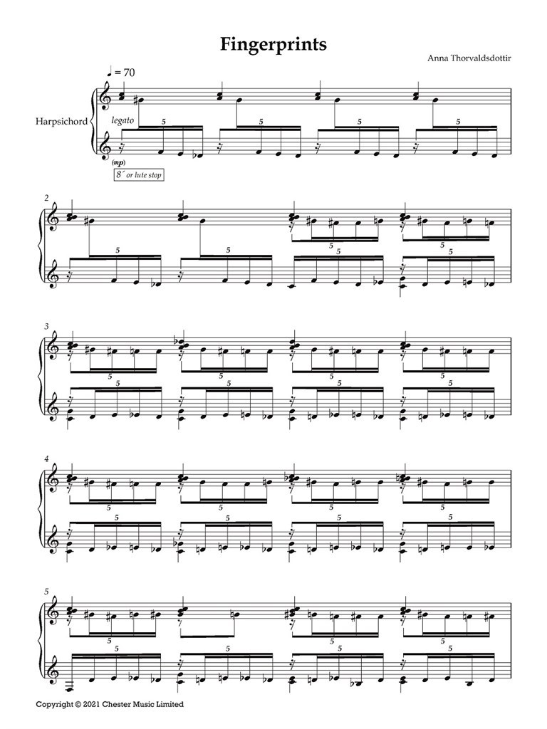 Fingerprints, for harpsichord, was written in 2003 and has been recorded by Guðrún Óskarsdóttir on the Smekkleysa label.