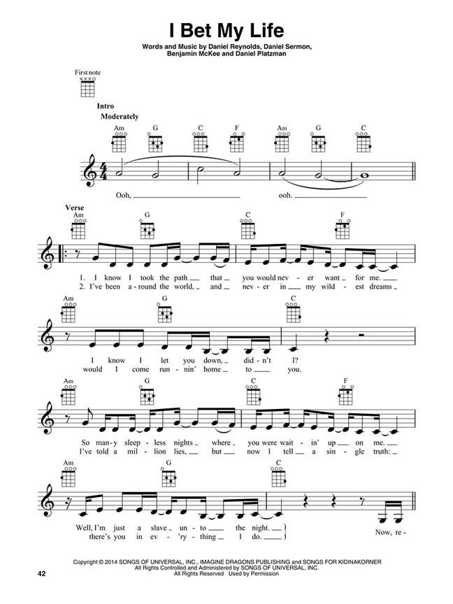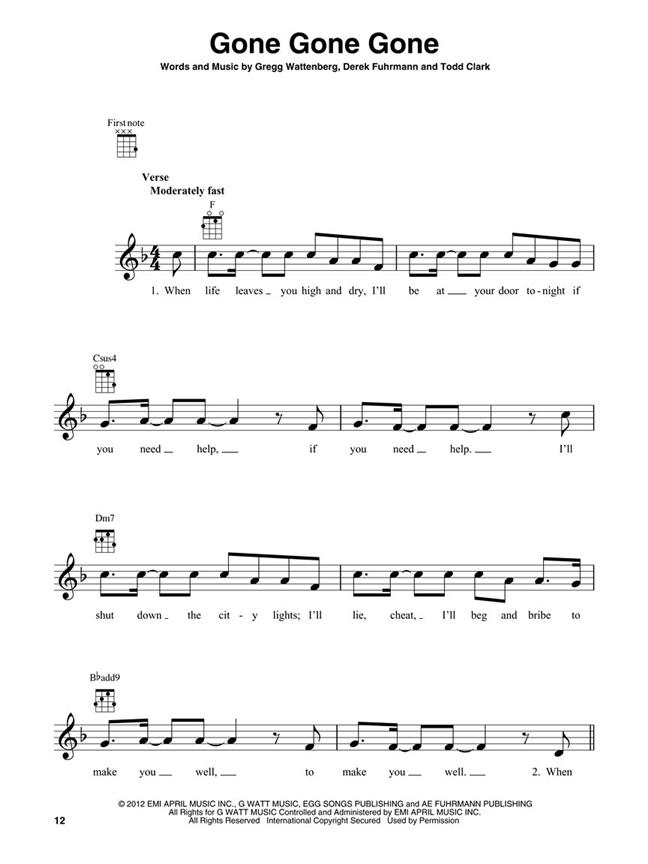 Retrouvez une selection de 20 hits incontournables du folk rock international d'aujourd'hui en trascriptions ligne mélodiques, paroles intégrales et diagrammes d'accords ukulele. Titres : 5 Years Time [Noah And The Whale] - Dirty Paws [Of Monsters And Men] - Gone, Gone, Gone [Phillips, Phillip] - Helplessness Blues [Fleet Foxes] - Ho Hey [Lumineers] - Home [Edward Sharpe And The Magnetic Zeroes] - I And Love And You [Avett Brothers, The] - I Bet My Life [Imagine Dragons] - I Will Wait [Mumford and Sons] - Little Lion Man [Mumford and Sons] - Little Talks [Of Monsters And Men] - Live And Die [Avett Brothers, The] - Man On Fire [Edward Sharpe And The Magnetic Zeroes] - Mykonos [Fleet Foxes] - Poison and Wine [Civil Wars, The] - Raging Fire [Phillips, Phillip] - Skinny Love [Bon Iver] - Stubborn Love [Lumineers, The] - Take 'Em Away [Old Crow Medicine Show] - The One That Got Away [Civil Wars, The]
