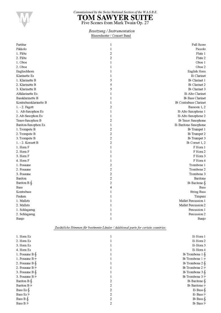 During his childhood The Adventures of Tom Sawyer was the favourite book of the composer Franco Cesarini. With his memories of the magic of joy, fear and freedom, Cesarini seeks to bring the figures of the book to life musically in his Tom Sawyer Suite. Each of the first four movements describes a figure from the story. Tom Sawyer is depicted in the first movement, where the characteristic “cake walk” rhythm is used. The second movement depicts Huckleberry Finn. The third movement is slower, more expressively melancholic and is dedicated to Becky Thatcher. Then there is Injun Joe, who tries to catch Tom in the fourth movement with the fifth movement leading to a happyend.