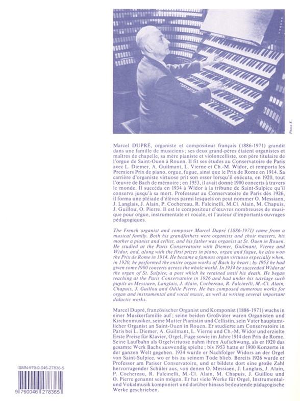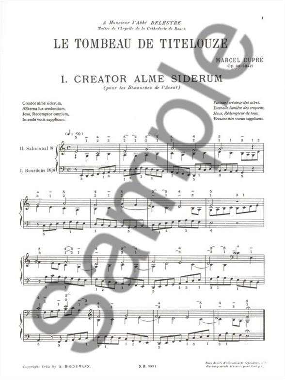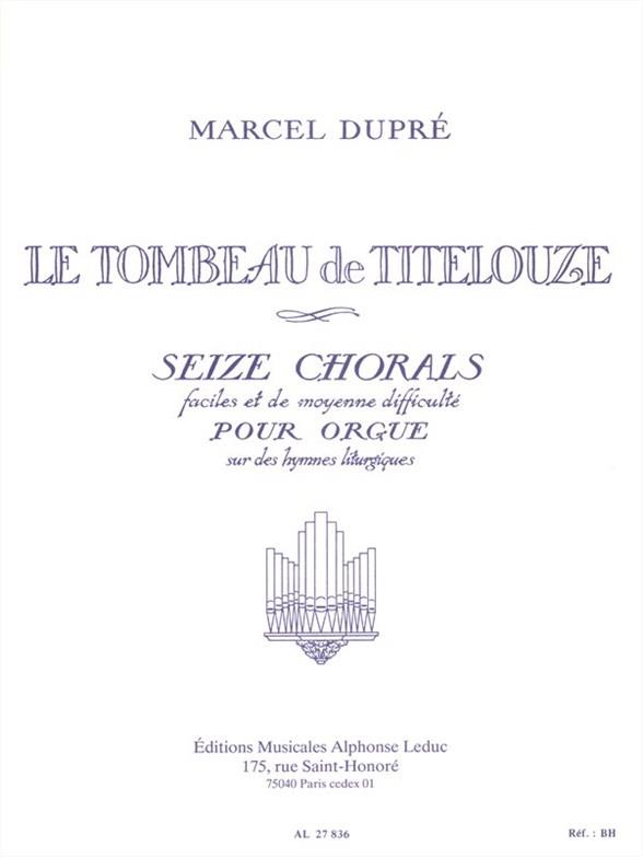 Composed in 1942, Titelouze’s tombstone by Marcel Dupré is a set of sixteen chorals for Organ. Based on liturgical rhythms, these chorals are rated easy and medium in term of difficulty. This musical memorial to Jehan Titelouze, an organist who lived at the period of the Spanish Armada (16th century), is a pedagogical work with melody mainly based on Gregorian music. These sixteen studies, all very different and very progressive are: 1. Creator Alme Siderum (3 voices – manuals only) 2. Jesu Redemptor Omnium (3 voices – manuals only) 3. A solis Ortus Cardine (3 voices) 4. Audi Benigne Conditor (3 voice) 5. Te Lucis Ante Terminum (4 voices) 6. Coelestis Urbs Jerusalem (4voices) 7. As Regias Agni Dapes (4 voices) 8. Veni Creator Spiritus (4 voices) 9. Vexilla Regis (4 voices) 10. Pange Lingua (3 voices) 11. Ave Maris Stella (4 voices) 12. Iste Confessor (4 voices) 13. Lucis Creator Optime (4 voices) 14. Ut Queant Laxis (5 voices) 15. Te Splendor et Virtus (5 voices) 16. Placare Christe Servullis (Toccata) Each choral of this set is really colourful and can be considered a masterpiece.