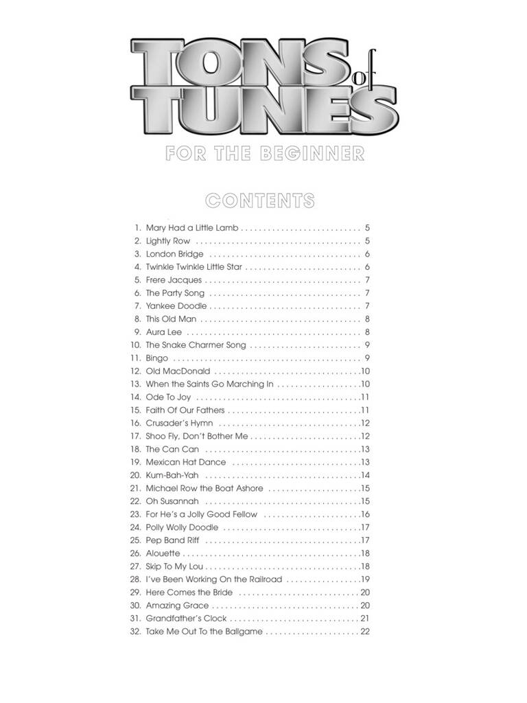 There are two things that beginners really want to do: play songs they recognize and play the TUNE. In Tons of Tunes for the Beginner, many of the easiest of familiar songs are gathered together so that young musicians can do just that – play the tunes to familiar music! Most of the songs can be performed by players who have learned only a few notes. Play along with the accompaniment tracks or with any combination of solo instruments for tons of practice fun! 32 favorite tunes, including: Bingo, I've Been Working on the Railroad, Ode to Joy, Take Me Out to the Ball Game, Yankee Doodle and more.