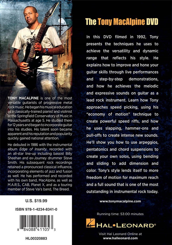 Tony MacAlpine se démarque sur la scène prog metal/rock. Ici, il présente des techniques pour atteindre la polyvalence et la gamme dynamique qui dominent son style. Il enseigne comment perfectionner ses compétences à travers des performances live, des démos étape par étape, ainsi que le speed picking grâce à sa technique « ecomonie du mouvement » pour créer des riffs puissants. Il reprend aussi des reprises utilisant des gifles, des hammer-ons et des pull-offs pour créer de nouveaux sons intenses. À la fin de ce DVD, vous comprendrez pourquoi Tony est l’un des guitaristes les plus remarquables du rock instrumental aujourd’hui. 53 minutes.