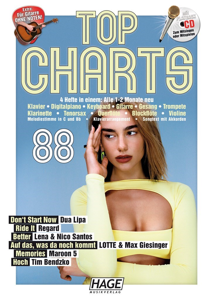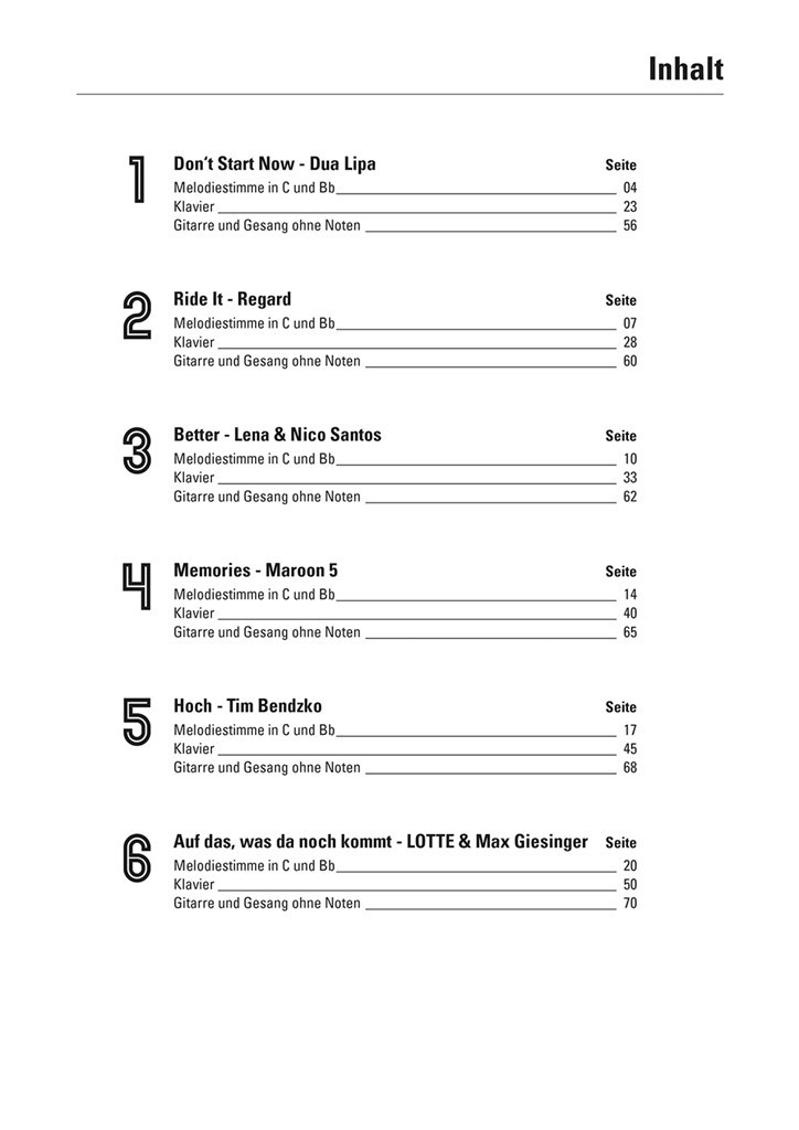 Dua Lipa ist zurück! Mit ihrer neuen Single DON’T START nos möchte die erfolgreiche Sängerin ein Kapitel ihres Lebens abschließen, um ein anderes zu beginnen: In eine neue Ära mit einem neuen Sound. RIDE IT vos Regard ist ein toller Allrounder. où in der Lounge oder auf dem Dancefloor, die House-Beats sorgen für eine entspannte Atmosphäre und machen einfach gute Laune. Besser geht es nicht - Lena und Nico Santoù schließen sich zusammen und liefern den gemeinsamen Hit BETTER. Es ist ein bittersüßes Duett und ein packender Ohrwurm, dem man die besondere Chemie zwischen den zwei erfolgreichen Pop-Acts Deutschlands deutlich anmerkt. LOTTE und Max Giesinger singen ein Loblied AUF DAS, WAS DA NOCH KOMMT: Das Sich-Hineinstürzen in den nächsten moment, das Aufêtehen nach dem Hinfallen und das Niemals-Stillstehen. Eine Hymne auf das Leben! In ihrem neuen Song meMORIES blicken Marooù 5 auf ihre 25-jährige Bandgeschichte zurück. In ihrer Single will die Band daher all denjenigen ‚Danke’ sagen, die sie seit ihren Anfängen bis heute begleitet haben und schaffen damit wortwörtlich neue Erinnerungen. Mit seiner neuen Single will Tim Bendzko wieder HOCH hinaus. Ein Motivations-Song, der ins Ohr geht, musikalisch einiges parat hält und dazu aufruft, auf den letzten metern nicht aufzugeben, sondern über seinen Schatten zu springen.