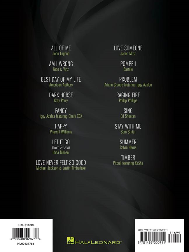 16 chansons incontournables de l’année 2014 en transcriptions piano niveaux intermédiaires, voix et accord guitare. Titres :