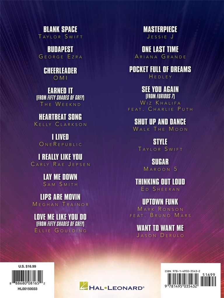 20 excellents morceaux des meilleurs artistes actuels sont inclus dans cette collection pour piano, voix et guitare. Inclut : Blank Space - Budapest - Cheerleader - Earned It (Fifty Shades of Grey) - Chanson Heartbeat - I Really Like You - Couche-moi - Lèvres bougent - Aime-moi comme tu le fais - Une dernière fois - À bientôt - Tais-toi et danse - Sugar - Thinking Out Loud - Funk urbain - Want to Want Me - et plus encore.