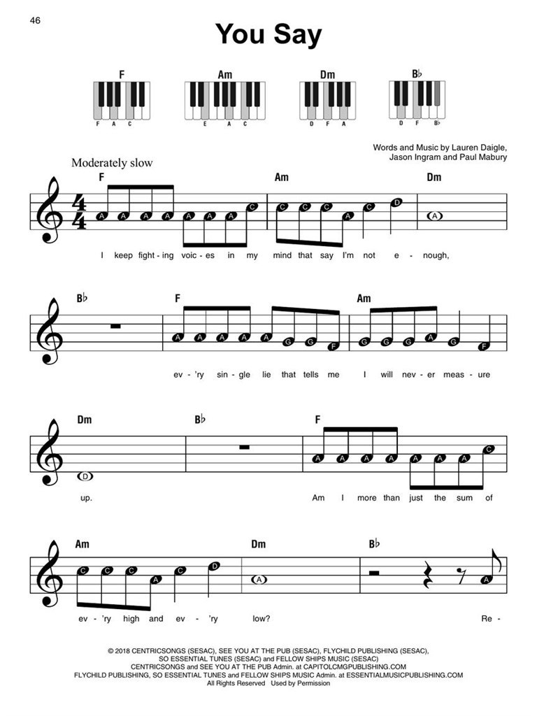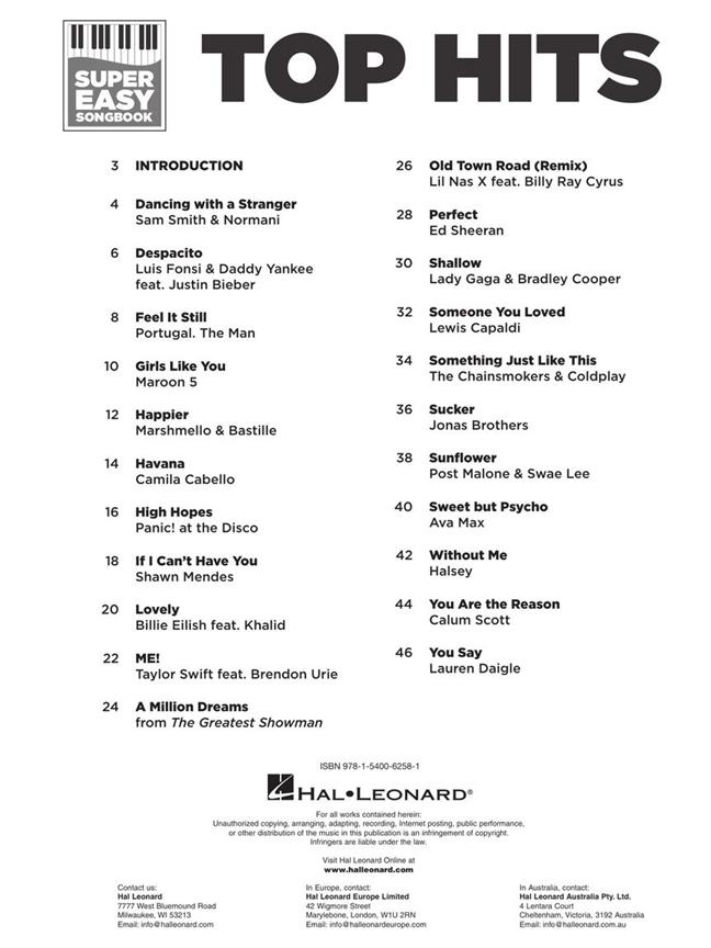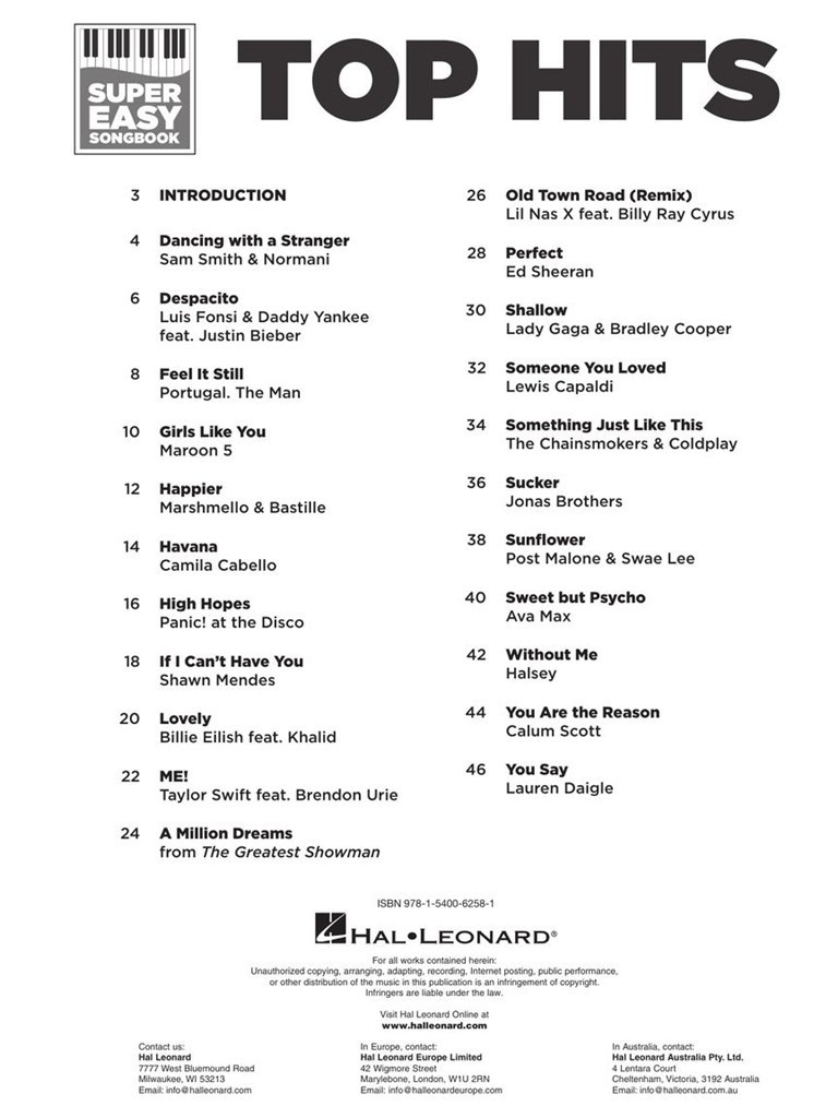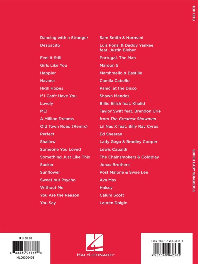 It's super easy! This series features accessible arrangements for piano, with simple right-hand melody, letter names inside each note, basic left-hand chord diagrams, and no page turns. This edition includes 22 hit songs: Dancing with a Stranger (Sam Smith and Normani) · Girls like You (Maroon 5) · High Hopes (Panic! At the Disco) · A Million Dreams (from The Greatest Showman) (P!nk) · ME! (Taylor Swift feat. Brendon Urie) · Old Town Road [Remix] (Lil Nas X feat. Billy Ray Cyrus) · Perfect (Ed Sheeran) · Someone You Loved (Lewis Capaldi) · Sucker (Jonas Brothers) · Without Me (Halsey) · You Are the Reason (Calum Scott) · and more.