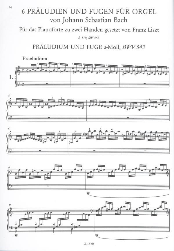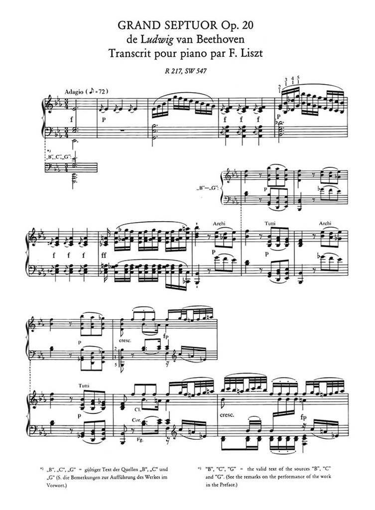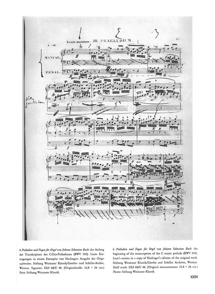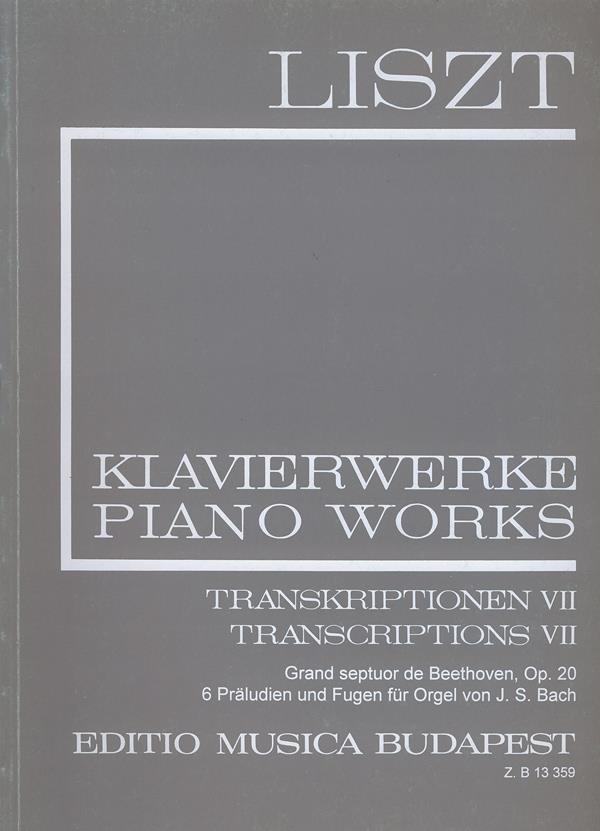 Volume 22 of series II of the New Liszt Edition contains two large-scale works by Liszt: the piano score of Beethoven's Septet for clarinet, horn, bassoon, violin, viola, cello, and double bass written at the turn of 1799 and 1800, and the piano transcription of six preludes and fugues for organ (in A minor, C major, C minor, C major, E minor, and B minor) by J. S. Bach (BWV 543-548). Unlike other volumes in the NLE, this volume gives all the textual variants of the Grand septuor, and in the Bach works it gives the most important authentic textual variations. At the beginning of the volume, after the preface to the edition, an informative preface by László Vikárius on the Bach series, and one by Imre Mezo on the Septet can be found in German and English, while the critical notes at the end of the volume are in English. The edition is published as both a hard clothbound volume and also as a soft paper bound volume as part of the series Liszt: Klavierwerke.