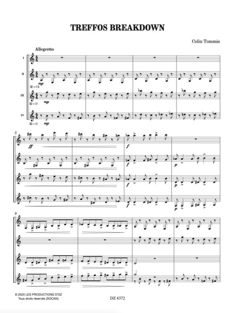 Elle est écrite pour un quatuor intermédiaire et est motorisée (ma voiture ne l’était pas !) tout en étant très amusante à jouer. Les membres de mon quatuor l’ont toujours aimée et elle était au répertoire à chaque fois que nous l’avons jouée. On y trouve des traces de pensée tritonale, mais cela ajoute juste du piquant à l’assaisonnement harmonique.