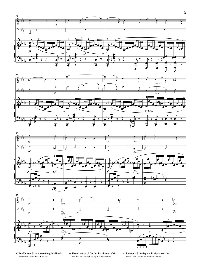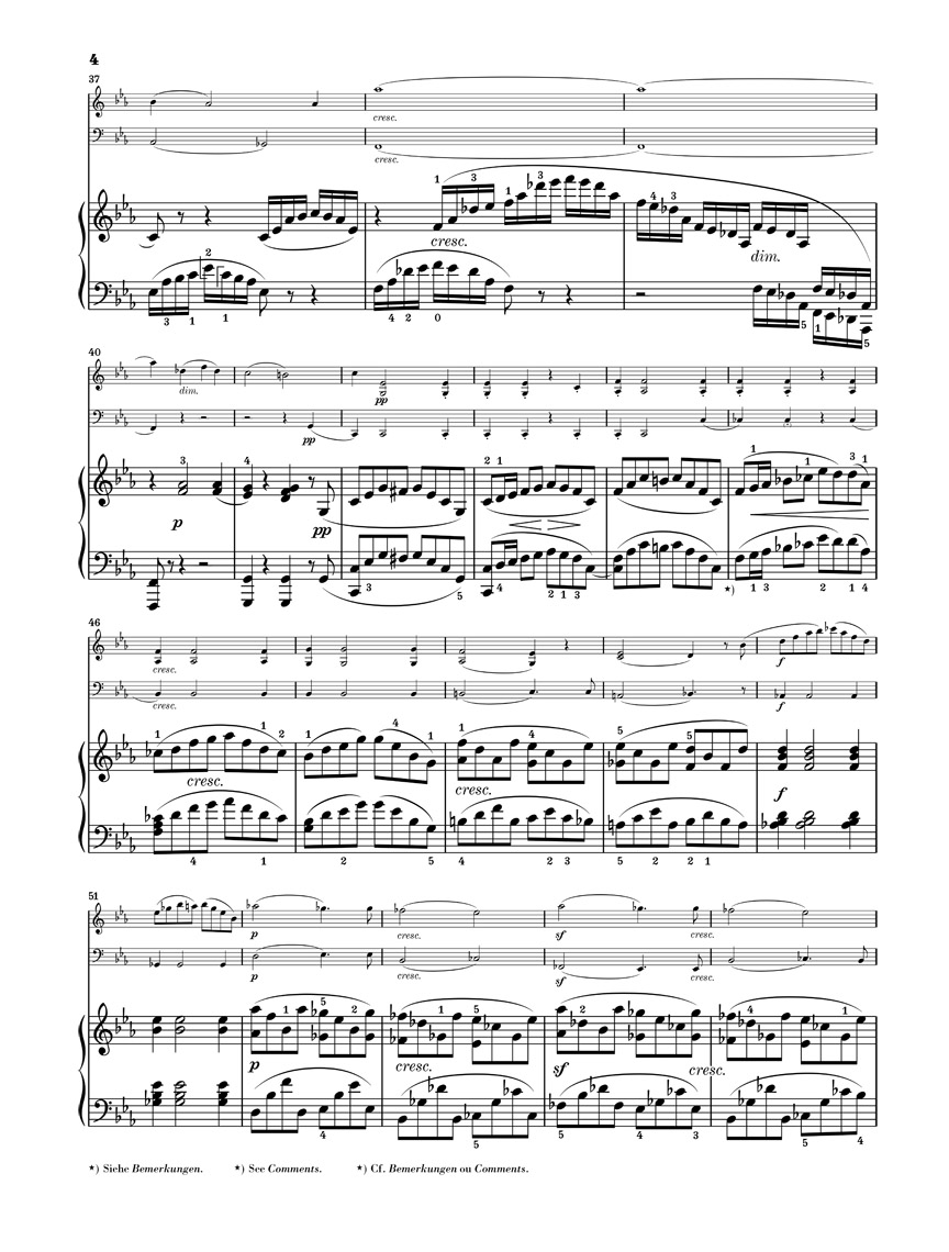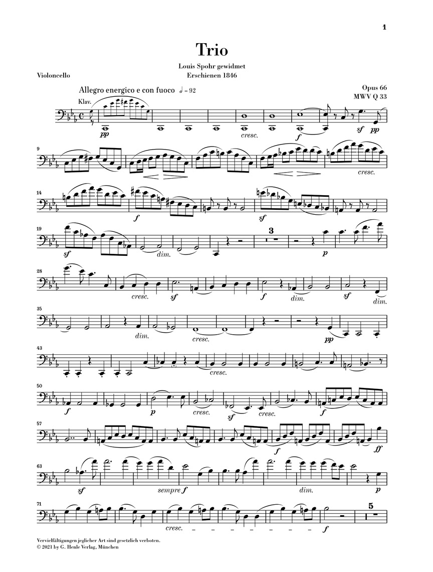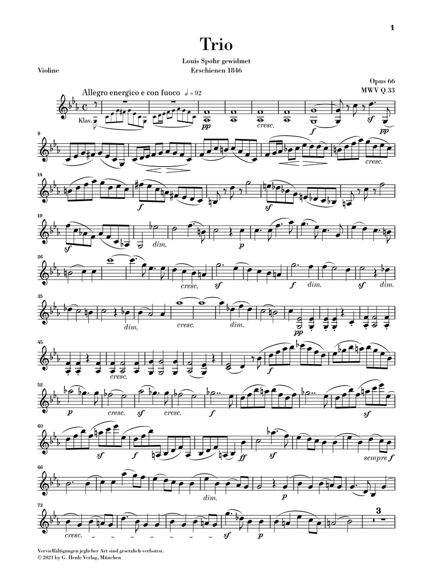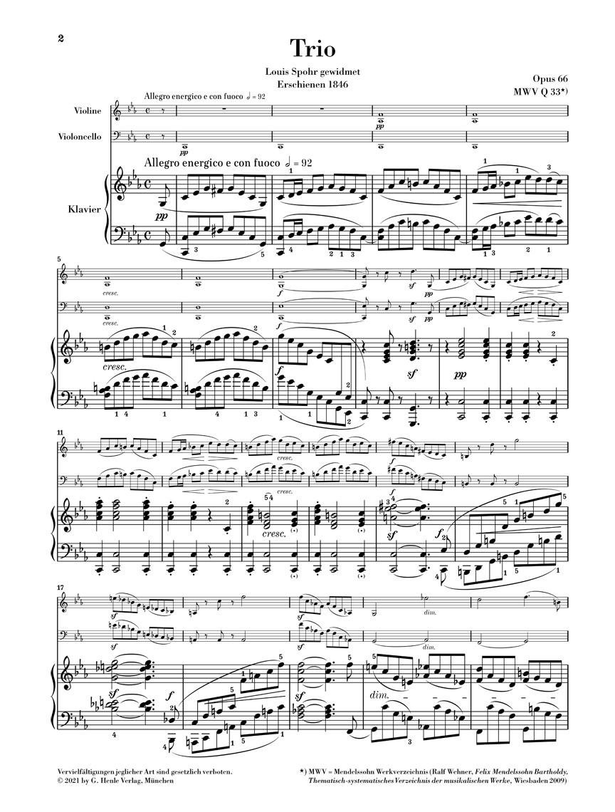 Après le grand succès de son premier Trio avec piano en ré mineur op. 49, cinq ans s’écoulèrent jusqu’à ce que Mendelssohn s’attelle à une nouvelle composition pour le même effectif. Le Trio en ut mineur vit alors le jour en un temps relativement court, en mars/avril 1845, et fut publié à peine un an plus tard. D’un caractère sensiblement plus sombre que son prédécesseur, ce deuxième trio est aussi considéré (notamment pour la partie de piano) comme incomparablement plus difficile sur le plan technique. De ce fait, il est demeuré un peu dans l’ombre du premier trio. Les connaisseurs en matière de musique de chambre l’apprécient cependant comme un ouvrage plus accompli et plus exigeant sur le plan de l’écriture musicale. La pièce, extraite du volume: Mendelssohn · Trios avec piano HN 957, est pour la première fois disponible séparément chez Henle dans une édition pratique pour l’exécution.