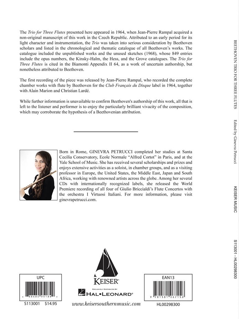 The Trio for Three Flutes here presented appeared in 1964, when Jean-Pierre Rampal acquired a non-original manuscript of this work in the Czech Republic. Attributed to an early period for its light character and instrumentation, the Trio was taken into serious consideration by Beethoven scholar and redactor of arguably the most complete of Beethoven's catalogues, the chronological and thematic catalogue of all Beethoven's works, including the unpublished ones and the unused sketches (1968), whose 849 entries include the opus numbers, the Kinsky-Halm, the Hess, and the Grove catalogues. The Trio for Three Flutes is cited in the Biamonti Appendix II 64, as a work of uncertain authorship, but nonetheless attributed to Beethoven. The first recording of the piece was released by Jean-Pierre Rampal, who recorded the complete chamber works with flute by Beethoven for the Club Français du Disque label in 1964, together with Alain Marion and Christian Lardé. In lack of further information able to confirm Beethoven's authorship of this work, all that is left to the listener and performer is to enjoy the particularly brilliant vivacity of the composition, which may corroborate the hypothesis of a Beethovenian attribution.