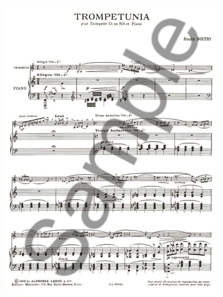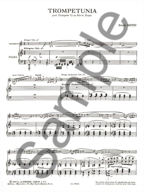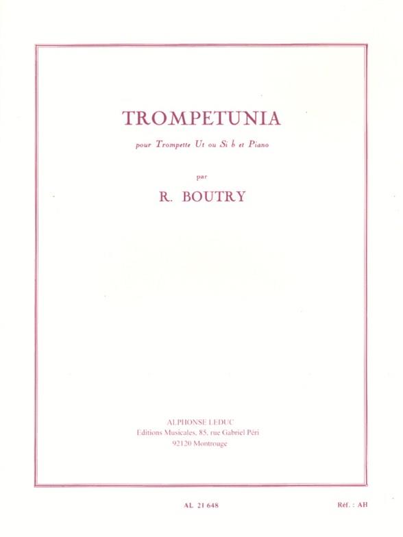 Composed by Roger Boutry, Trompetunia is a piece for C or Bb Trumpet and Piano accompaniment. Quite difficult, it is ideal for upper-intermediate levels and above. Starting with an introduction ; Allegro, this melodious piece is divided into three main parts: ; Andantino, ; Allegro Vivace and ; Allegretto. The first part features a Cadenza, while the second, more lyrical, includes some sections with the sourdine. The last part is more syncopated and more rhythmic before the harmonious finale. Born in France in 1932, Roger Boutry received numerous prizes, including those for Piano, Composition and Conducting. He received the Grand Prix de Rome in 1954. His career was quite successful, alternating between Harmony professor, composer and conductor. He also received numerous prizes for his amazing compositions.