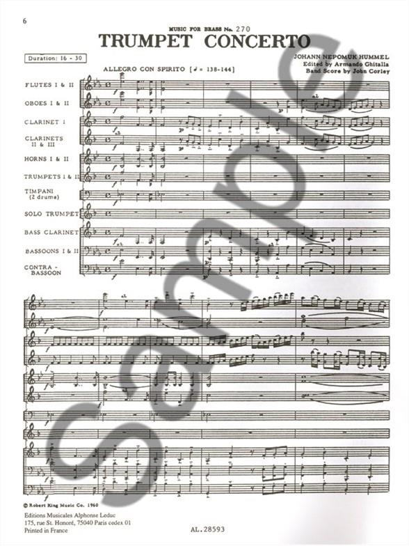 Écrit en 1803 par Johann Nepomuk Hummel (1778-1837), ce Concerto pour trompette est une pièce classique du répertoire pour trompette. Cette version du concerto comprend la partition et la partie pour trompette et fanfare. Composé dans l’esprit de Mozart, l’orchestre est composé de : - Flûte I & II (2) - Hautbois I & II (2) - Clarinette I (2) - Clarinette II (2) - Clarinette III (2) - Cors I & II (2) - Trompettes I & II (2) - Timbales - Trompette solo - Clarinette basse (2) - Bassons I & II (2) - Countrabassoon Ancien élève de Mozart, Johann NepomukHummel (1778-1837) fut un compositeur brillant, pianiste, chef d’orchestre et enseignant. Évoluant à la même époque que Beethoven, il devint tout aussi célèbre et écrivit de nombreux concertos (pour piano, hautbois, trompette, violon et autres), des opéras et quelques pièces de musique à vent.