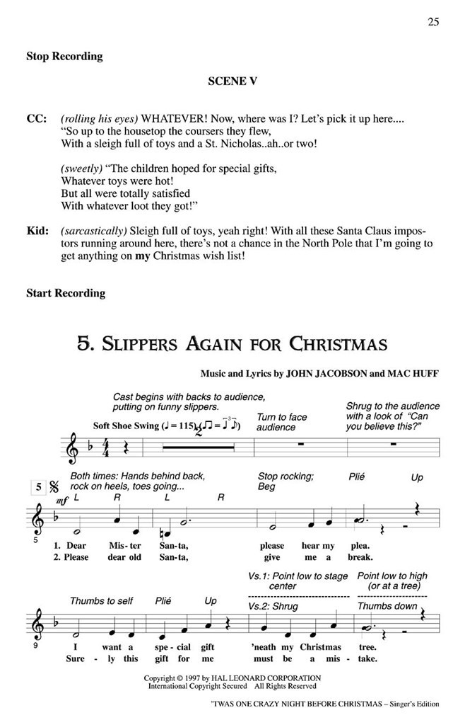 C'était la veille de Noël et dans toute la maison, pas un bruit, pas même… Attendez une minute ! Que se passe-t-il ? La musique de maman résonne dans la cuisine, ma sœur imite Martha Stewart du mieux qu'elle peut, papa et les oncles sont installés devant la télé, et les enfants… hmmm ? Découvrez avec humour l'ambiance de Noël dans une famille américaine typique grâce à des chansons entraînantes, des gags hilarants et une soirée de divertissement qui fera rire aux éclats votre public ! Le manuel du professeur contient le script complet, les chansons accompagnées et des suggestions de chorégraphie. L'édition pour chanteurs propose uniquement les lignes vocales, le script et la chorégraphie. Jouez le spectacle au piano seul ou ajoutez une touche professionnelle avec la cassette ou le CD ShowTrax. Disponible : manuel du professeur, édition pour chanteurs (pack de 5), CD d'extrait (spectacle complet), cassette et CD ShowTrax. Durée : 35 minutes. Du CP au CM2.