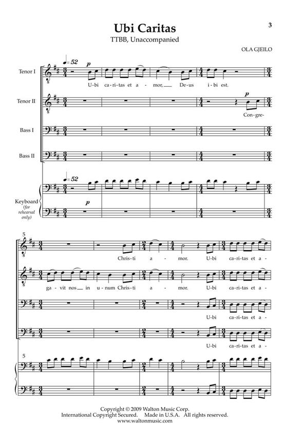Avec un son à la fois moderne et médiéval, ce remarquable arrangement réalisé à partir du texte latin Ubi Caritas s'ouvre à l´unisson en évoquant un thème en plain-chant. Peu à peu, ce dernier s'enrichit d'harmonies plus amples et d'un langage musical résolument contemporain. Pas forcément difficile quant à la tessiture vocale exploitée, l'arrangement de Ola Gjeilo est accessible à bon nombre de choeurs mixtes. Absolument fascinant en toute occasion !
