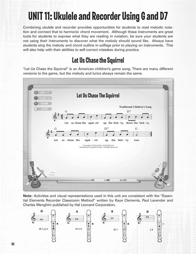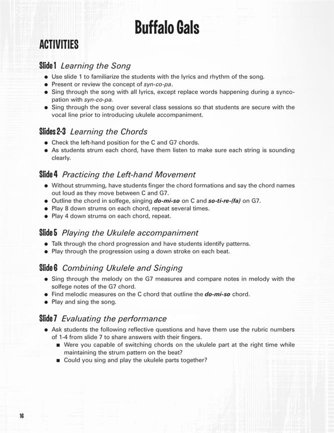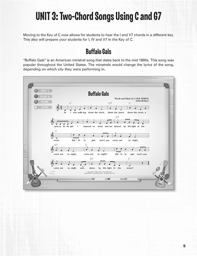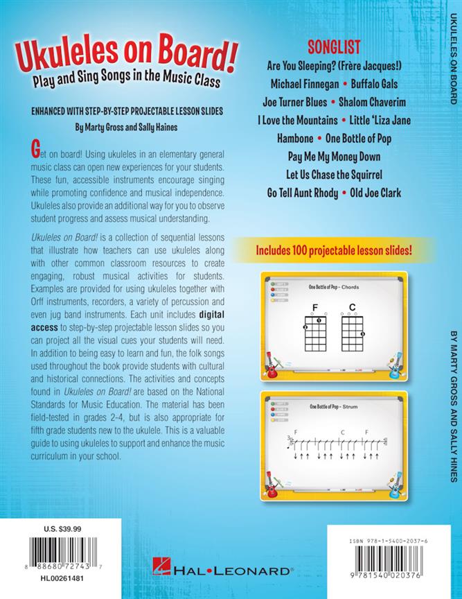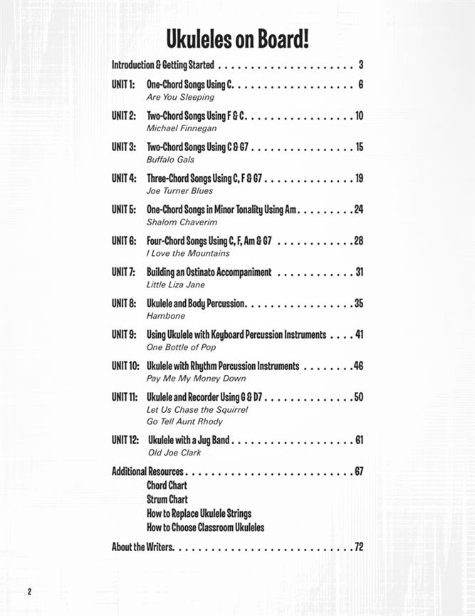 Get on board! Using ukuleles in an elementary general music class can open new experiences for your students. These fun, accessible instruments encourage singing while promoting confidence and musical independence. Ukuleles also provide an additional way for you to observe student progress and assess musical understanding. UKULELES ON BOARD is a collection of sequential lessons that illustrate how teachers can use ukuleles along with other common classroom resources to create engaging, robust musical activities for students. Examples are provided for using ukuleles together with Orff instruments, recorders, a variety of percussion and even jug band instruments. Each unitincludes digital access to step-by-step projectable lesson slides so you can project all the visual cues your students will need. In addition to being easy to learn and fun, the folk songs used throughout the book provide students with cultural and historical connections. The activities and concepts found in UKULELES ON BOARD are based on the National Standards for Music Education. The material has been field-tested in grades 2-4, but is also appropriate for fifth grade students new to the ukulele. This is a valuable guide to using ukuleles to support and enhance the music curriculum in your school. Songs include: Are You Sleeping? (Frere Jacques!), Michael Finnegan, Buffalo Gals, Joe Turner Blues, Shalom Chaverim, I Love the Mountains, Little 'Liza Jane, Hambone, One Bottle of Pop, Pay Me My Money Down, Let Us Chase the Squirrel, Go Tell Aunt Rhody, Old Joe Clark. Suggested for grades 2-5. Get on board! Using ukuleles in an elementary general music class can open new experiences for your students. These fun, accessible instruments encourage singing while promoting confidence and musical independence. Ukuleles also provide an additional way for you to observe student progress and assess musical understanding. Ukuleles On Board! is a collection of sequential lessons that illustrate how teachers can use Ukuleles along with other common classroom resources to create engaging, robust musical activities for students. Examples are provided for using Ukuleles together with Orff instruments, Recorders, a variety of Percussion and even Jug Bandinstruments. Each unit includes digital access to step-by-step projectable lesson slides so you can project all the visual cues your students will need. In addition to being easy to learn and fun, the folk songs used throughout the book provide students with cultural and historical connections. The activities and concepts found in Ukuleles On Board! are based on the National Standards for Music Education. The material has been field-tested in grades 2-4, but is also appropriate for fifth grade students new to the Ukulele. This is a valuable guide to using Ukuleles to support and enhance the music curriculum in your school. Songs include: 'Are You Sleeping? (Frere Jacques!)', 'Michael Finnegan', 'Buffalo Gals', 'Joe Turner Blues', 'Shalom Chaverim', 'I Love the Mountains', 'Little 'Liza Jane', 'Hambone', 'One Bottle of Pop', 'Pay Me My Money Down', 'Let Us Chase the Squirrel', 'Go Tell Aunt Rhody', 'Old Joe Clark and rdquo - . Suggested for grades 2-5.