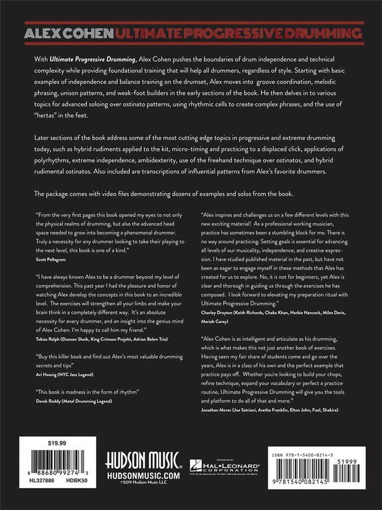 Ultimate Progressive Drumming, by Alex Cohen, pushes the boundaries of drum independence and technical complexity while providing foundational training that will help all drummers, regardless of style. Starting with basic independence and balance training on the drums, Cohen moves into groove coordination, melodic phrasing, unison patterns, and weak-foot builders in the early sections of the book. He then delves in to various topics for advanced soloing over ostinato patterns and using rhythmic cells to create complex phrases. Later sections of the book address some of the most cutting edge topics in progressive and extreme drumming today, such as hybrid rudiments applied to the kit, micro-timing and practicing to a displaced click, applications of polyrhythms, extreme independence, ambidexterity, and use of the freehand technique over ostinatos. Also included are transcriptions of influential patterns from Alex's favorite drummers. The package comes with over 50 minutes of video demonstrating dozens of examples and solos from the book.