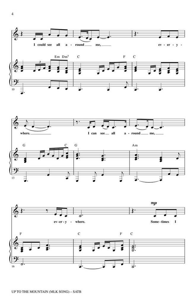 Cette chanson de la chanteuse folk Patty Griffin a été écrite en hommage au Dr Martin Luther King, Jr. et illustre de façon vivante le discours « I’ve Been to the Mountaintop » prononcé la veille de son assassinat. Interprétée plus récemment par Kelly Clarkson lors de l’émission caritative Idol Gives Back 2006, la chanson continue d’inspirer les auditeurs par son message puissant et ses sonorités imprégnées de gospel. Disponibles séparément : SATB, SAB, SSA, ShowTrax CD. Parties rythmiques disponibles en numérique (syn, gtr, b, dm). Durée : environ 16h00.