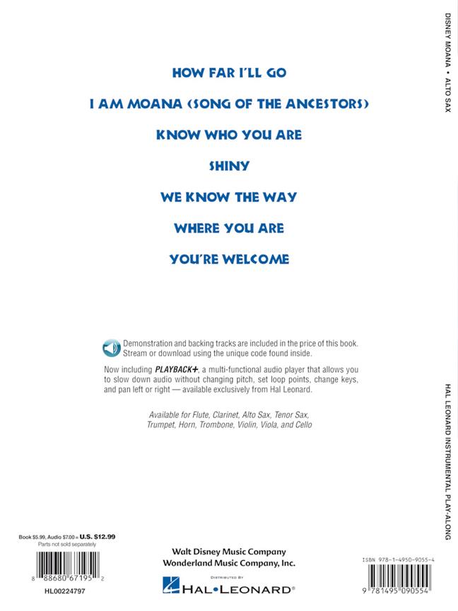 Seven arrangements from the Disney hit movie Moana penned by Lin-Manuel Miranda are included in this collection for instrumentalists. Each book features online access to audio demonstration tracks for download or streaming to help you hear how the song should sound. Songs include: How Far I'll Go - I Am Moana (Song of the Ancestors) - Know Who You Are - Shiny - We Know the Way - Where You Are - You're Welcome.