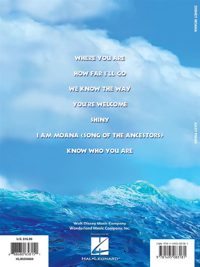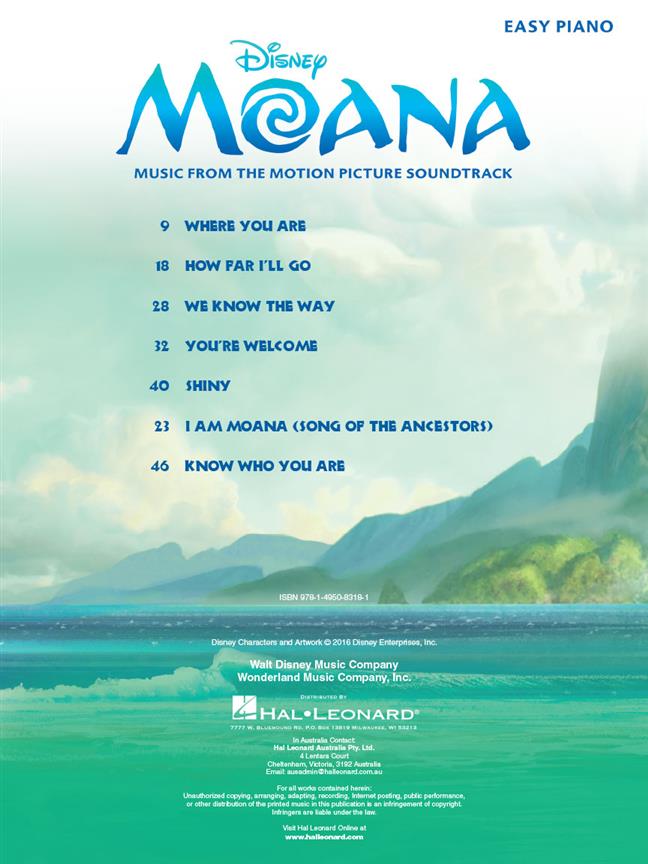 9 selections arranged for easy piano from Disney's big 2016 release featuring songs from Lin-Manuel Miranda. Songs include: How Far I'll Go - I Am Moana (Song of the Ancestors) - An Innocent Warrior - Know Who You Are - Logo Te Pate - Shiny - We Know the Way - Where You Are - You're Welcome. This souvenir folio also includes beautiful full-color scenes from the film.