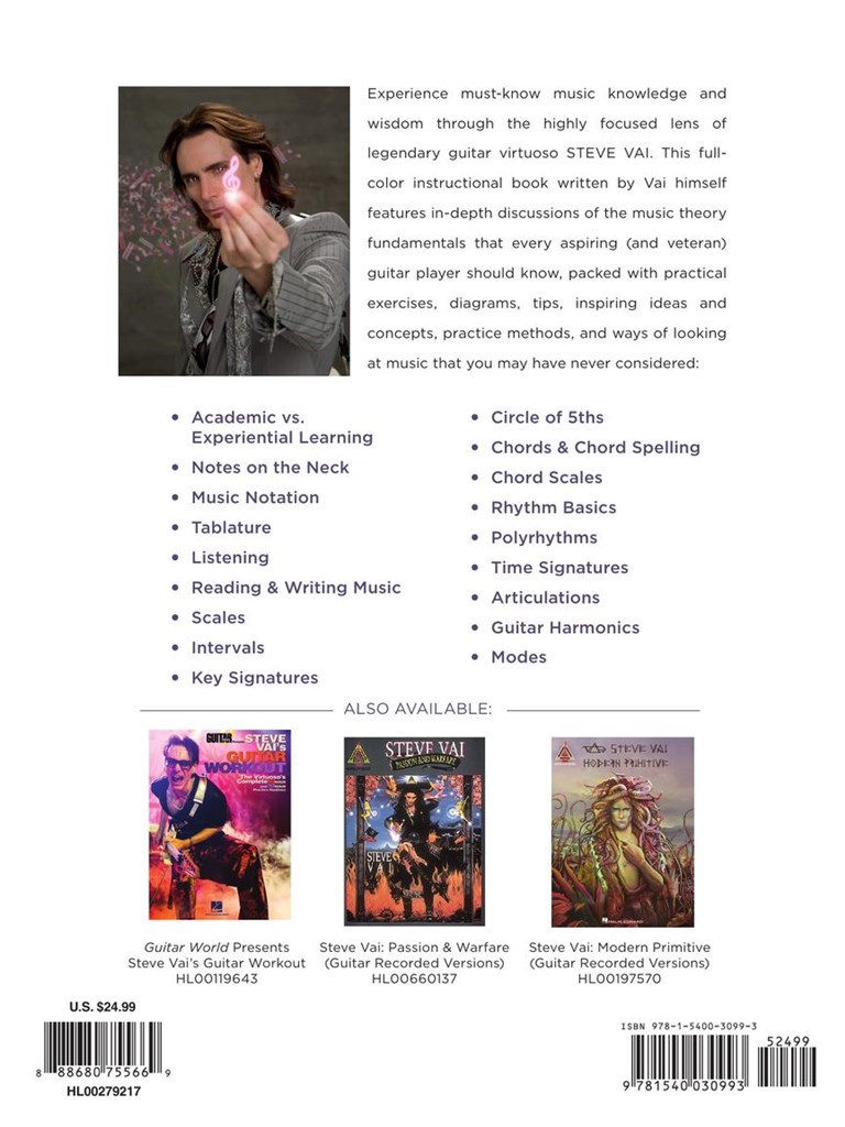 Experience must-know music knowledge and wisdom through the highly focused lens of legendary guitar virtuoso Steve Vai. This full-color instructional book written by Vai himself features in-depth discussions of the music theory fundamentals that every aspiring (and veteran) guitar player should know, packed with practical exercises, diagrams, tips, inspiring ideas and concepts, practice methods, and ways of looking at music that you may have never considered. Topics covered include: academic vs. experiential learning - reading and writing music - key signatures - chord scales - rhythm basics - guitar harmonics - modes - and much more. This beautiful book is full-color throughout and features artwork on every page by Vai!