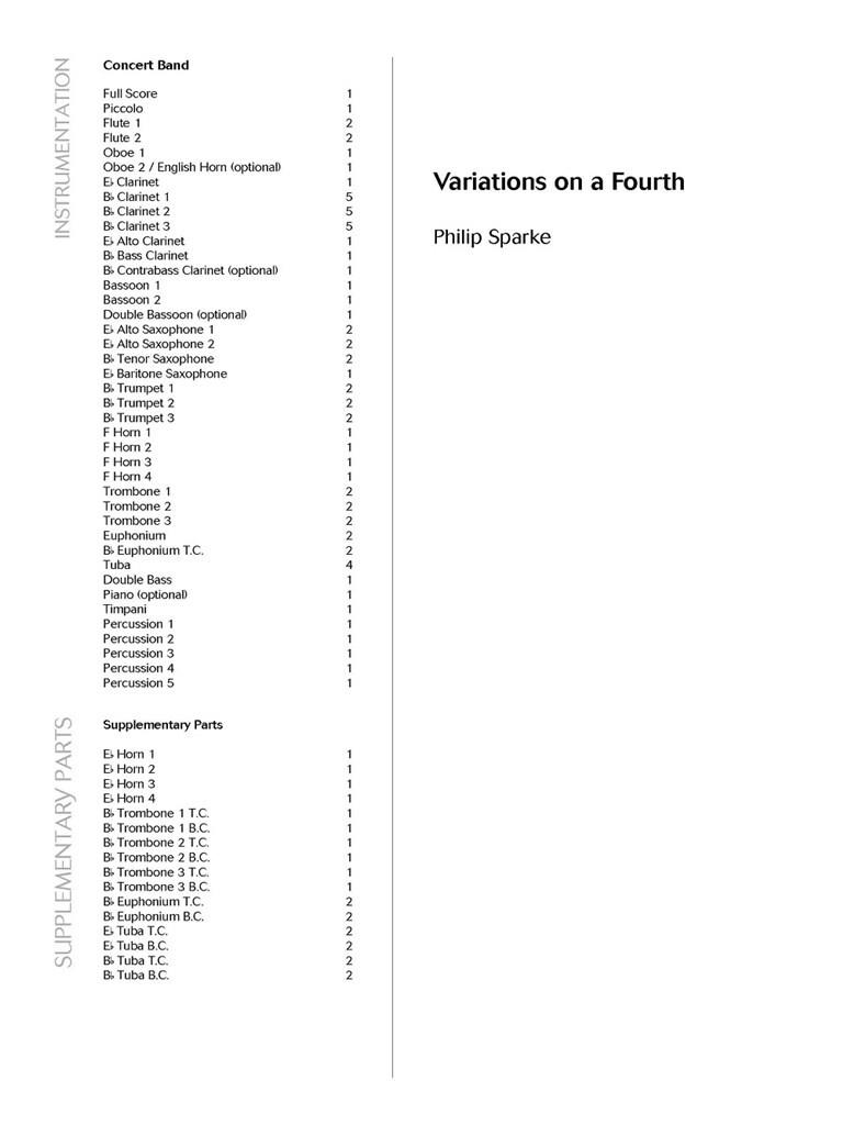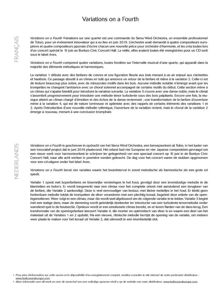 Variations on a Fourth (Variations sur une quarte) est une commande du Siena Wind Orchestra de Tokyo. Quatre compositeurs européens et quatre compositeurs japonais avaient chacun écrit une nouvelle pièce pour orchestre d’harmonie, en vue d’un concert spécial tenu le 15 juin 2019 au Bunkyo Civic Concert Hall où les huit pièces – enregistrées la veille pour un CD – ont été interprétées. Variations on a Fourth comprend quatre variations, toutes fondées sur l’intervalle musical d’une quarte, qui apparaît dans la majorité des éléments mélodiques et harmoniques. Il en résulte une œuvre en quatre mouvements qui plaira à un large public et enchantera ses interprètes !