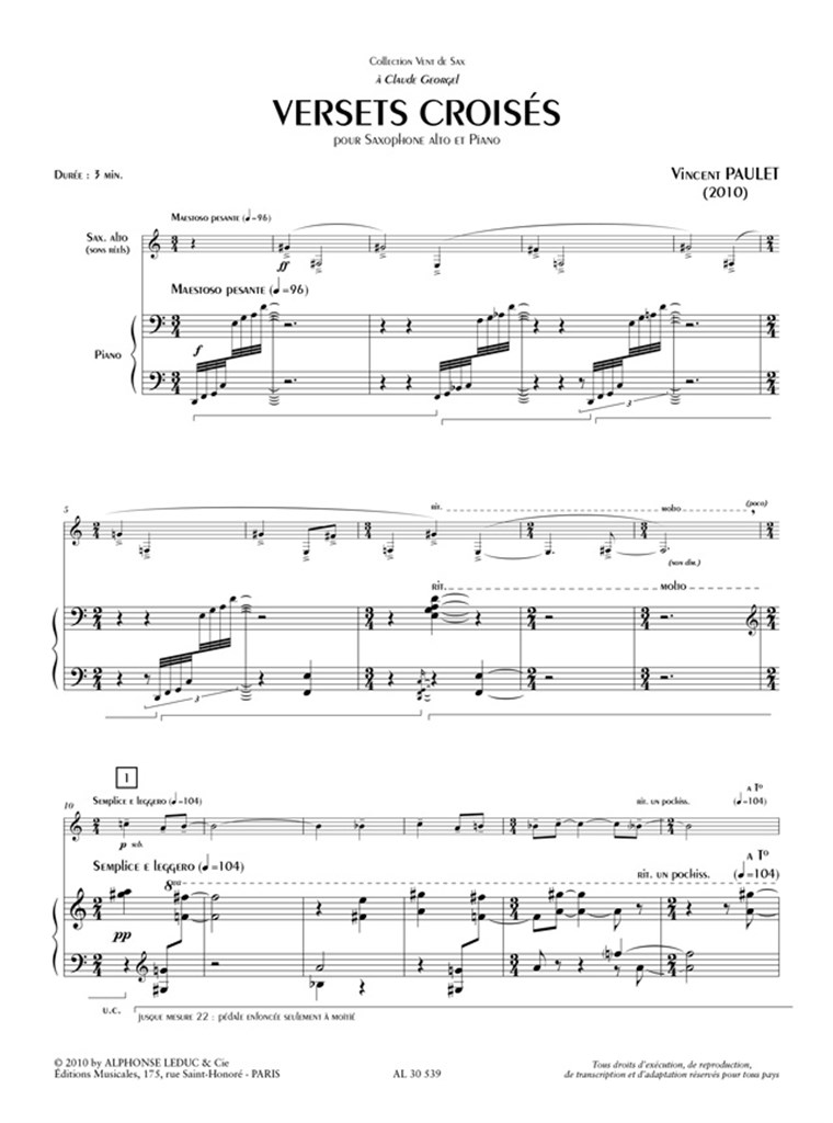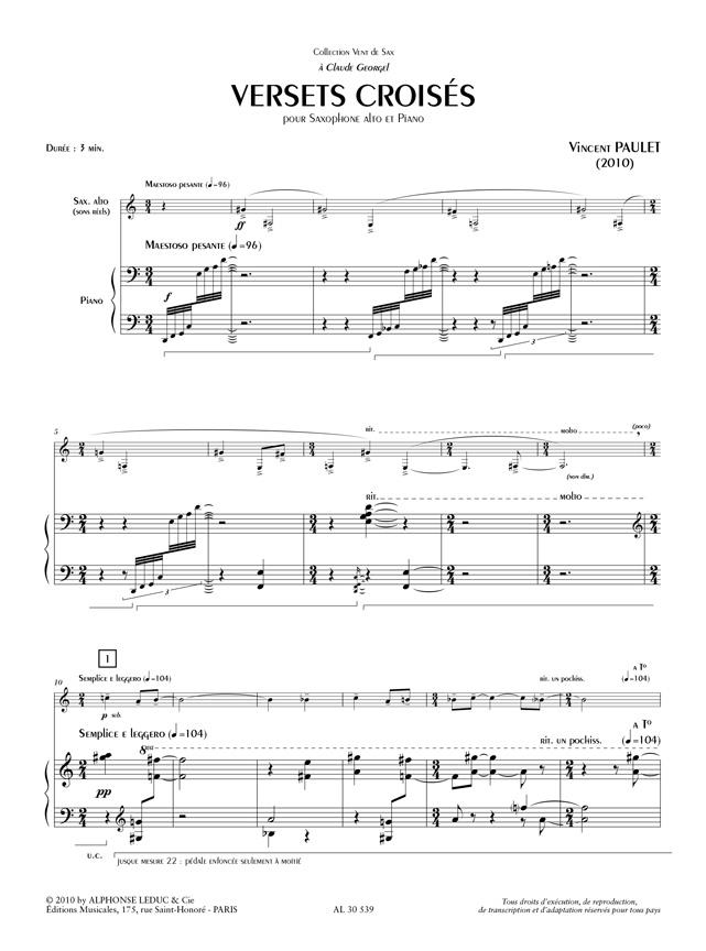 Versets croises (3') (3e) (collection vent de sax) pour saxophone alto et piano. Par Paulet aux editions Leduc. Partition / Livre de chansons pour Saxophone