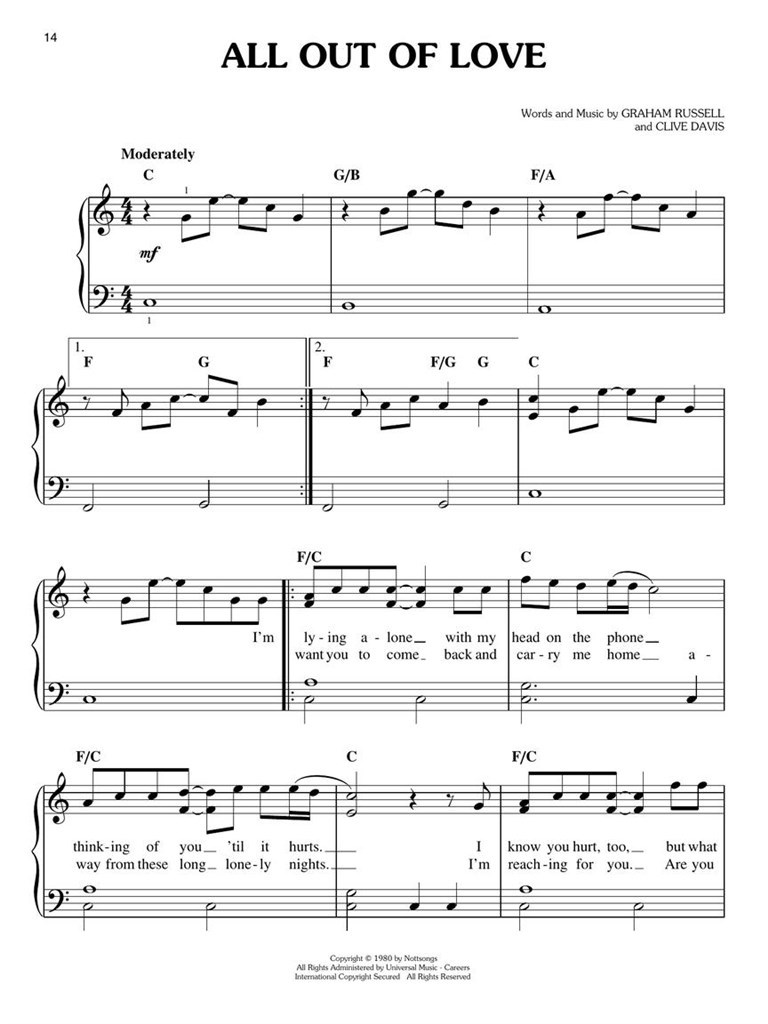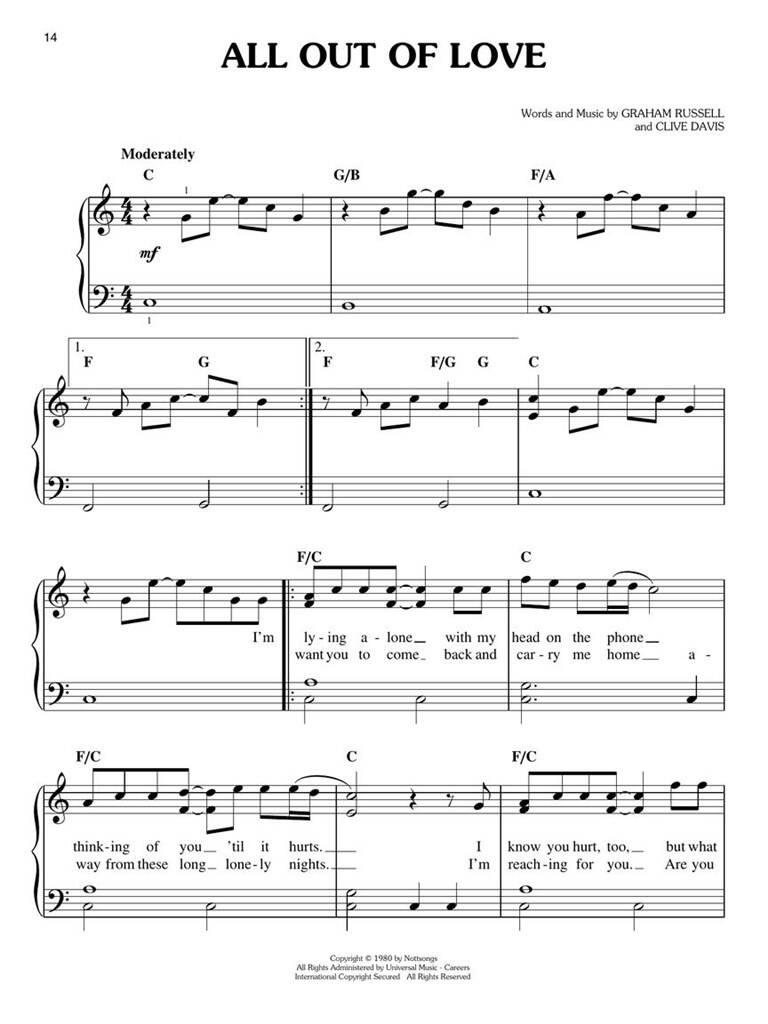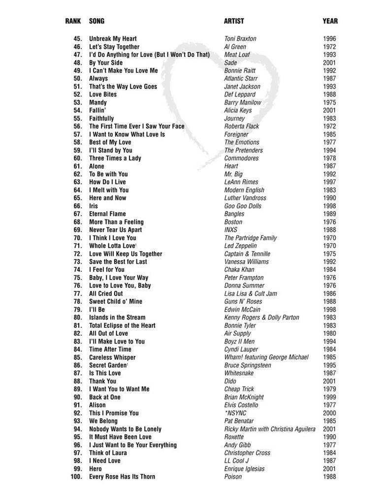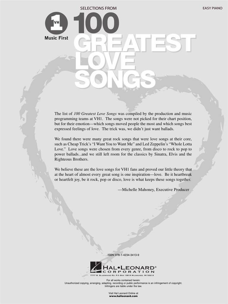 Les toutes meilleures chansons d’amour de tous genres choisies par VH1 et classées du 1 au 100. Comprend des arrangements faciles de : I Will Always Love You * My Heart Will Go On * Maybe I’m Amazed * Love Me Tender * Open Arms * Unchained Melody * et des dizaines d’autres, ainsi que des informations sur le processus de sélection. 480 pages de musique exceptionnelle !