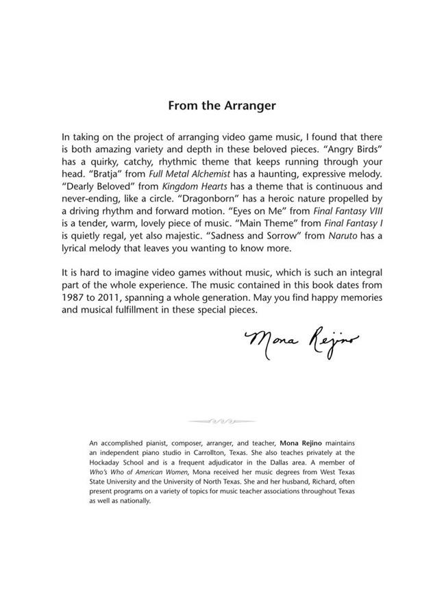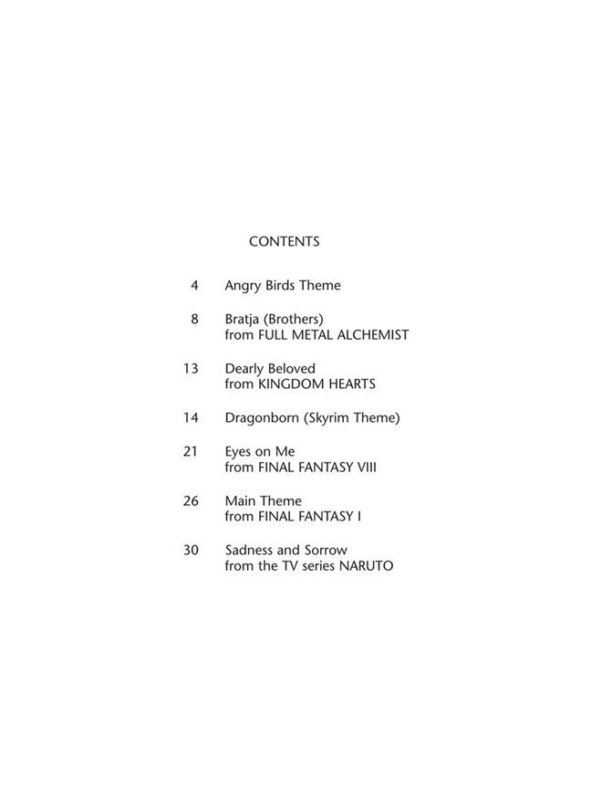 Music from 7 popular video games arranged for early intermediate/intermediate piano! Titles: Angry Birds Theme · Bratja (Full Metal Alchemist) · Dearly Beloved (Kingdom Hearts) · Dragonborn (Skyrim Theme) · Eyes on Me (Final Fantasy VIII) · Main Theme (Final Fantasy I) · Sadness and Sorrow (Naruto).