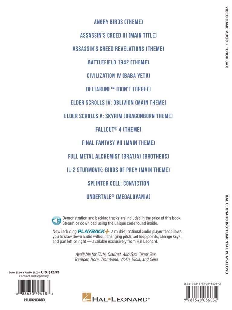 Themes from 14 favorite contemporary video games are included in this collection for beginning solo instrumentalists. It features online access to audio demonstration and backing tracks for download or streaming to help you hear how the song should sound and then to play-along and sound like a pro! Includes themes from: Angry Birds - Assassin's Creed III - Assassin's Creed Revelations - Battlefield 1942 - Civilization IV (Baba Yetu) - Deltarune (Don't Forget) - Elder Scrolls IV and V - Fallout" 4 - Final Fantasy VII - Full Metal Alchemist (Bratja) (Brothers) - IL-2 Sturmovik: Birds of Prey - Splinter Cell: Conviction - Undertale (Megalovania).