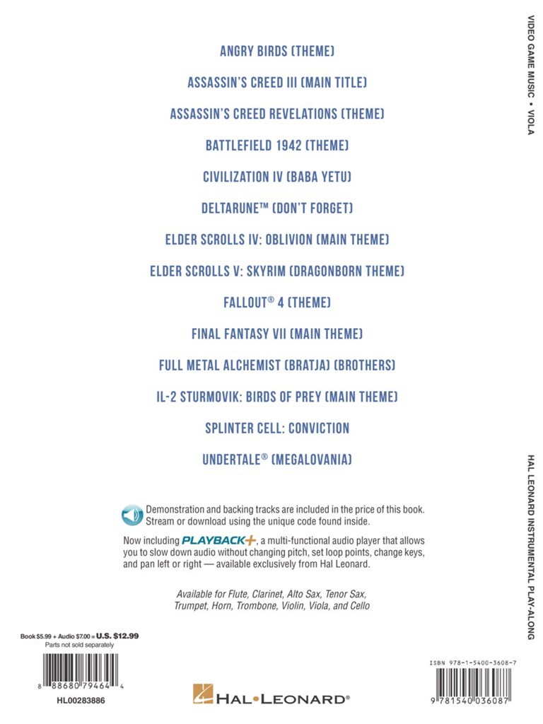 Themes from 14 favorite contemporary video games are included in this collection for beginning solo instrumentalists. It features online access to audio demonstration and backing tracks for download or streaming to help you hear how the song should sound and then to play-along and sound like a pro! Includes themes from: Angry Birds - Assassin's Creed III - Assassin's Creed Revelations - Battlefield 1942 - Civilization IV (Baba Yetu) - Deltarune (Don't Forget) - Elder Scrolls IV and V - Fallout" 4 - Final Fantasy VII - Full Metal Alchemist (Bratja) (Brothers) - IL-2 Sturmovik: Birds of Prey - Splinter Cell: Conviction - Undertale (Megalovania).