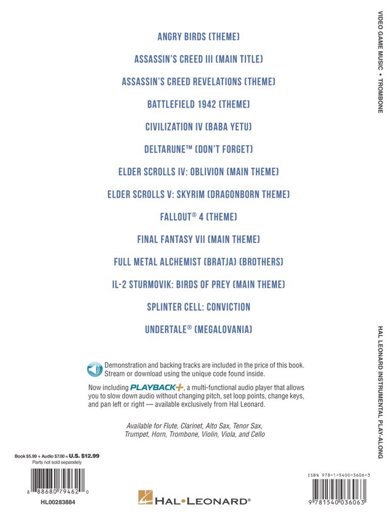 Themes from 14 favorite contemporary video games are included in this collection for beginning solo instrumentalists. It features online access to audio demonstration and backing tracks for download or streaming to help you hear how the song should sound and then to play-along and sound like a pro! Includes themes from: Angry Birds - Assassin's Creed III - Assassin's Creed Revelations - Battlefield 1942 - Civilization IV (Baba Yetu) - Deltarune (Don't Forget) - Elder Scrolls IV and V - Fallout" 4 - Final Fantasy VII - Full Metal Alchemist (Bratja) (Brothers) - IL-2 Sturmovik: Birds of Prey - Splinter Cell: Conviction - Undertale (Megalovania).