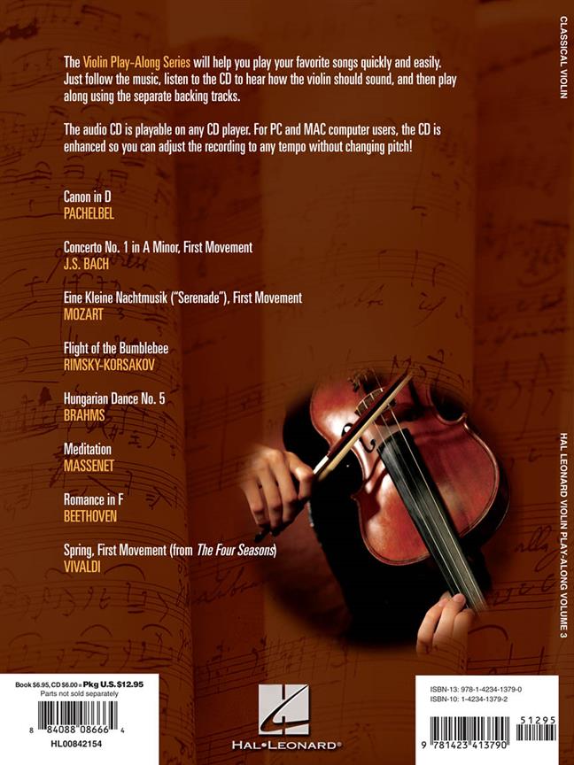 8 morceaux classiques transcrits pour violon. La série Violin Play-Along vous aidera à apprendre rapidement ces morceaux. En effet en plus des partitions, le CD audio contient 2 version de chaque morceau : une démonsatration compléte et une version sans violon pour que vous puissiez jouer accompagné.