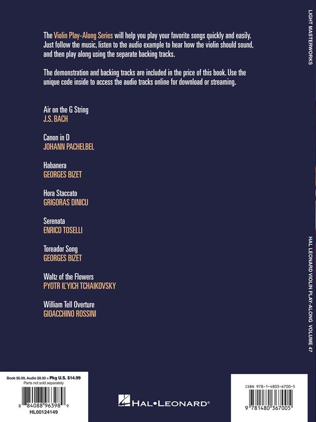 Violin Play-Along Volume 47: Light Masterworks features sheet music for eight songs, including Air on the G String, Canon in D, Waltz of the Flowers and more.