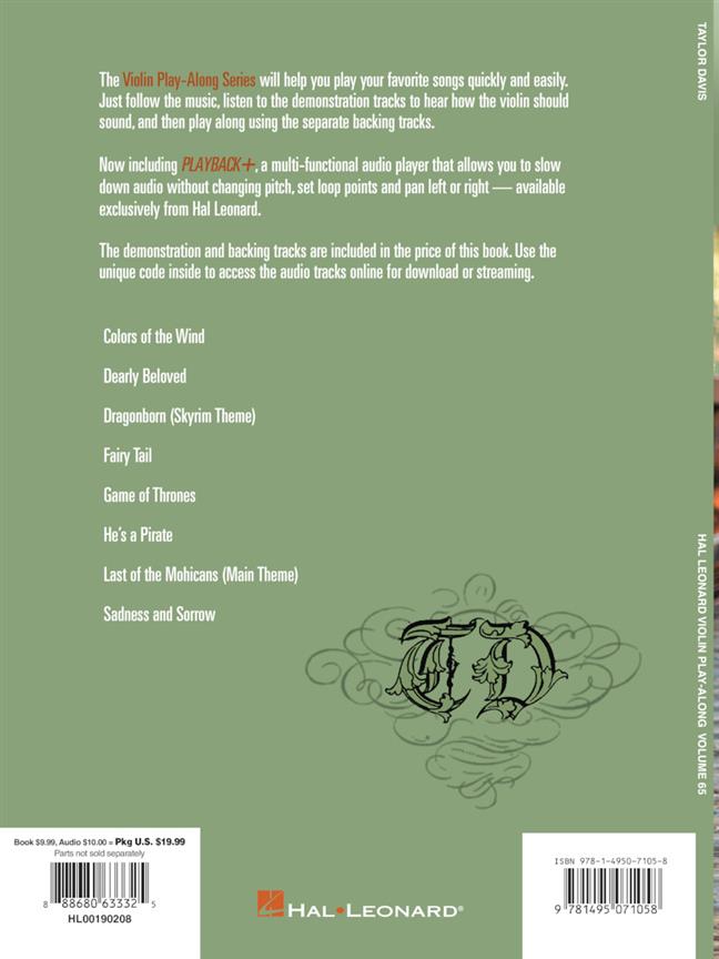 The Violin Play-Along series will help you play your favorite songs quickly and easily. Just follow the music, listen to the online audio to hear how the violin should sound, and then play along using the separate backing tracks. With the melody and lyrics included in the book, you may also choose to sing along. Chord symbols are provided should you wish to elaborate on the melody. The audio includes PLAYBACK+ features that allow you to loop passages, change the tempo, and more. This volume includes: Colors of the Wind - Dearly Beloved - Dragonborn (Skyrim Theme) - Fairy Tale Theme - Game of Thrones - He's a Pirate - Last of the Mohicans (Main Theme) - Sadness and Sorrow.