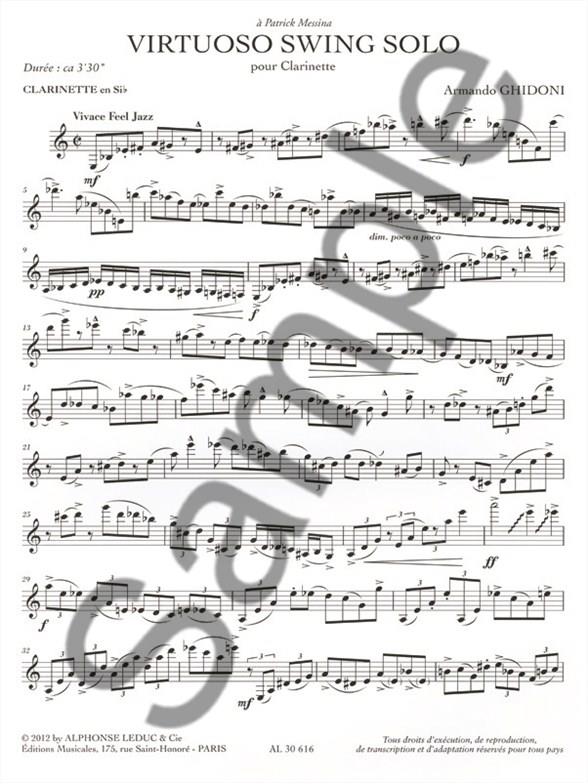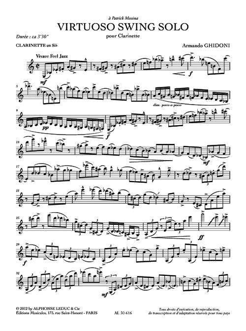 Virtuoso swing solo (3'30'') pour Clarinettete si b seule. Par Ghidoni aux éditions Leduc. Partition / Livre de chansons pour Clarinette