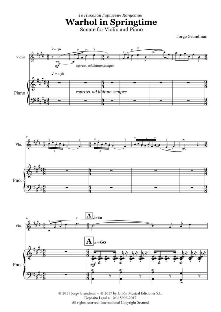 Originally written for flute and piano and commissioned by the 17th Toledo International Music Festival, Warhol in Springtime takes its name from Andy Warhol and is structured as if a painting were composed from the same image in different tonalities. It should last approximately 15 minutes, in reference to Warhol's famous phrase. The dynamics and expression of the work should be matched by both performers, flautist and pianist, as they feel it. It is dedicated to the late Ukrainian composer Nikolai Kapustin. It belongs to the cycle of four sonatas for flute and piano called The Warhol's Four Seasons of New York.