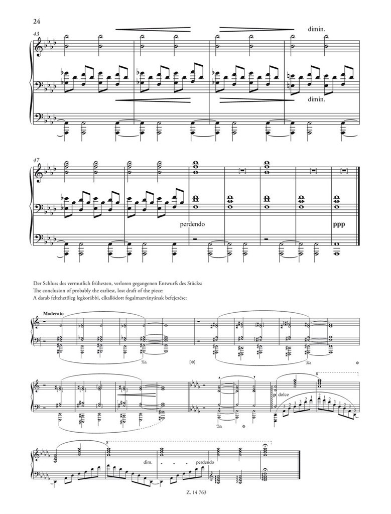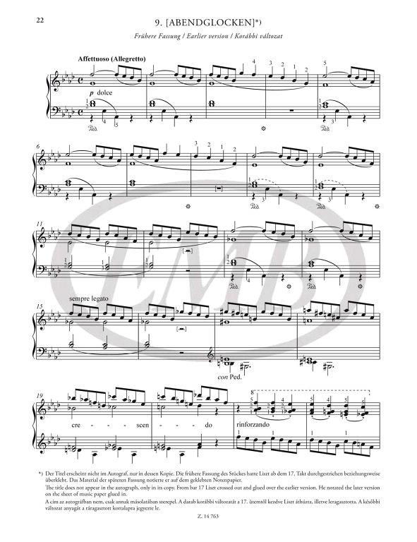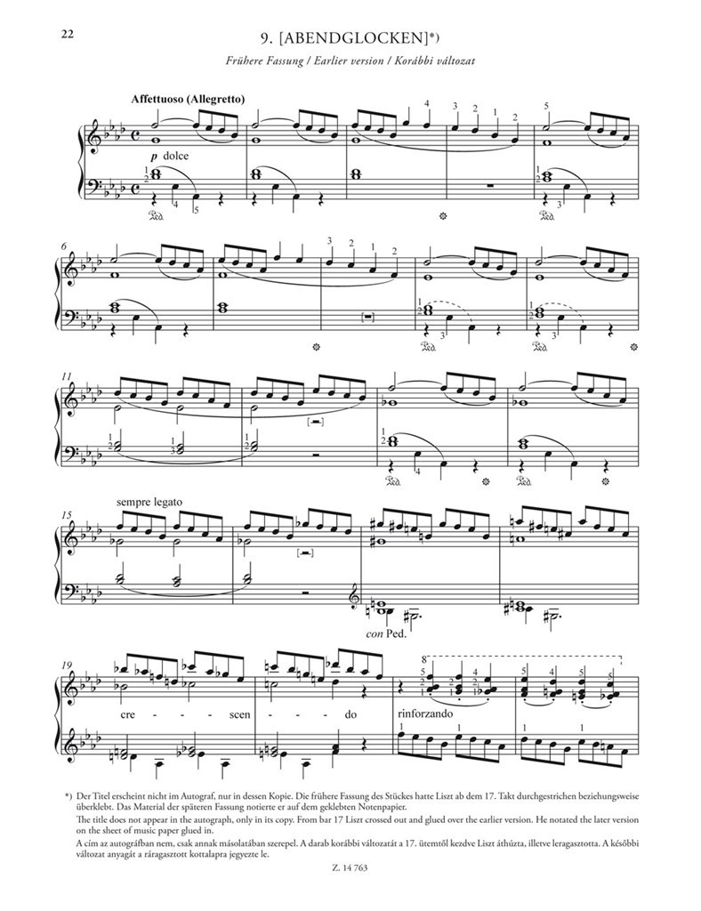 Supplement Volume 14 of the New Liszt Edition contains mostly unpublished early versions of piano works from the last two decades of the composer’s life. The bulk of the volume comprises pieces from Volume 3 of Années de pelerinage and the Weihnachtsbaum cycle. Of the latter, two complete early versions are extant. One of these consists of pieces which are shorter and more condensed than the final version. For performer and listener alike, it is an exciting experience to become familiar with this set of pieces in its early form. Among the individual pieces in this volume, the autograph version of the beautifully evocative Schlummerlied im Grabe is also published here for the first time. Finally, Liszt’s characteristically economical attitude to composing can be studied in the original form of what can be considered as the common starting point for La lugubre gondola I and II. The latest volume of the New Liszt Edition also contains a detailed preface in German, English, and Hungarian, including new results of research, five manuscript facsimiles, and critical notes. Along with the cloth-bound Complete Edition, a paperback version for practical use has also been published. This edition’s contents are identical to those of the hardcover edition, except for the omission of the critical notes.