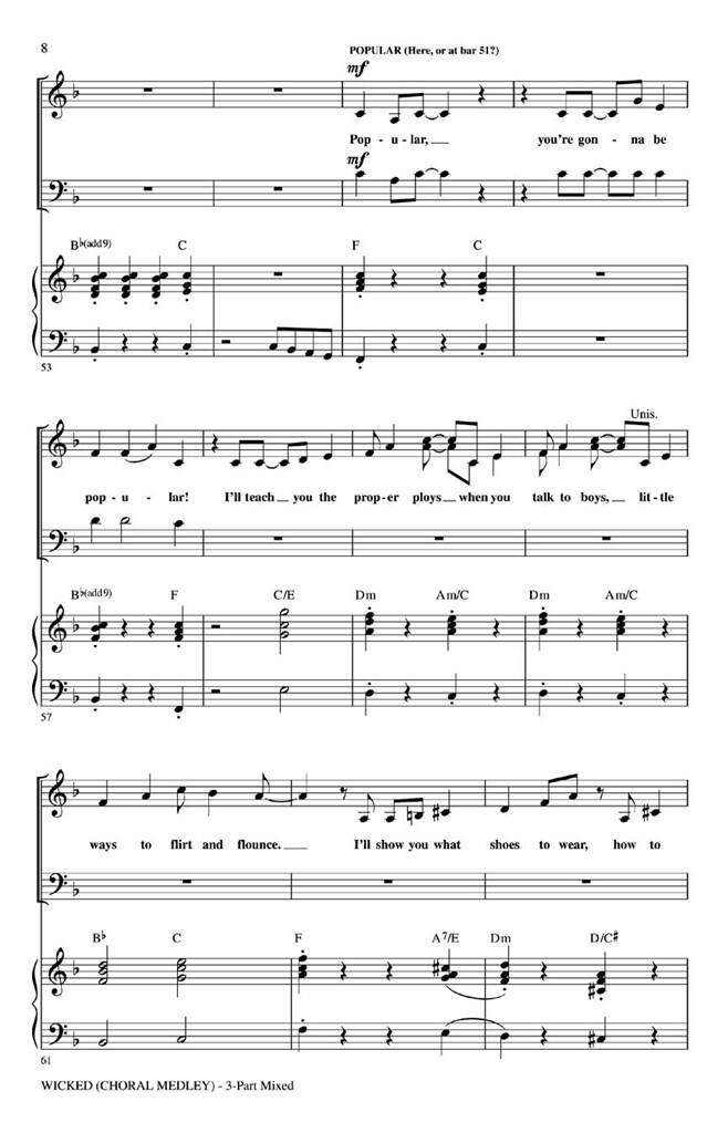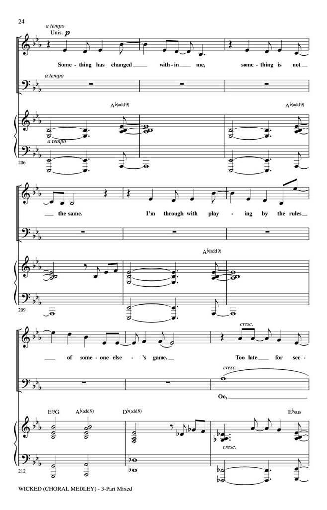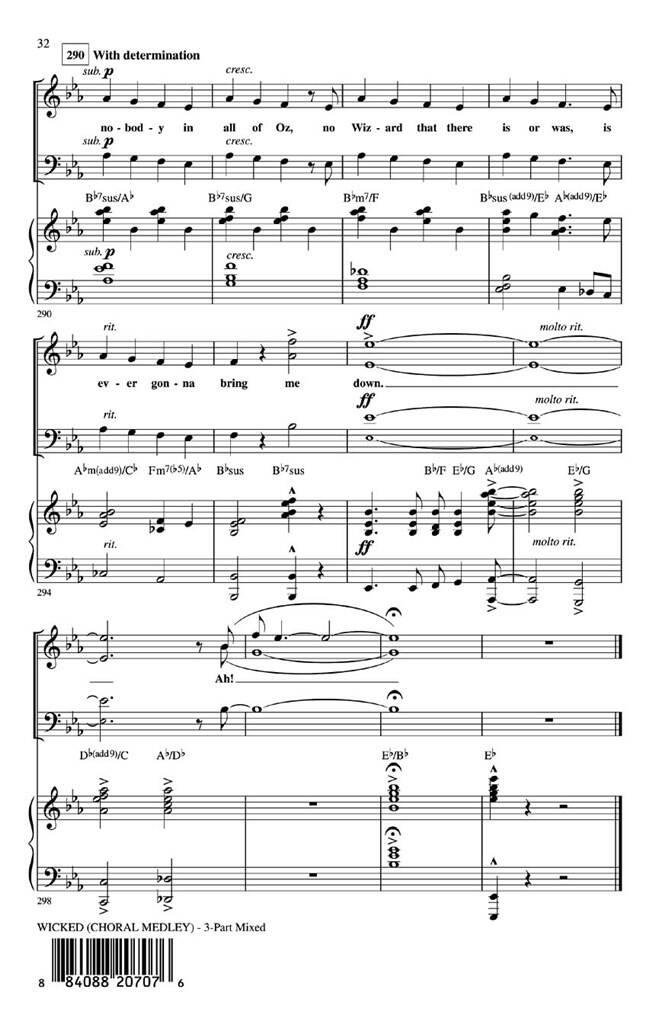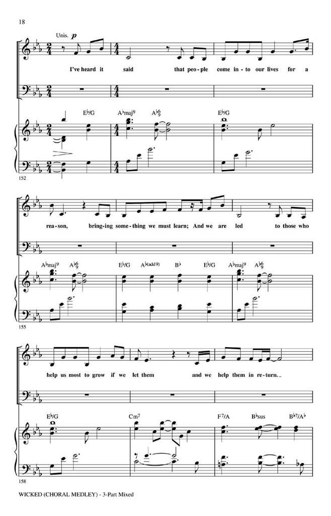 Les jeunes chœurs adoreront interpréter ce medley de 12 minutes bien conçu tiré de Wicked ! Une attention particulière portée aux tessitures, à la conduite vocale et à l’attrait intégré des chansons garantissent le succès ! Inclut : Defying Gravity, For Good, One ShortDay, Popular. Durée : Environ 10h30. Disponible séparément : mixé en 3 parties, en 2 parties et CD ShowTrax.