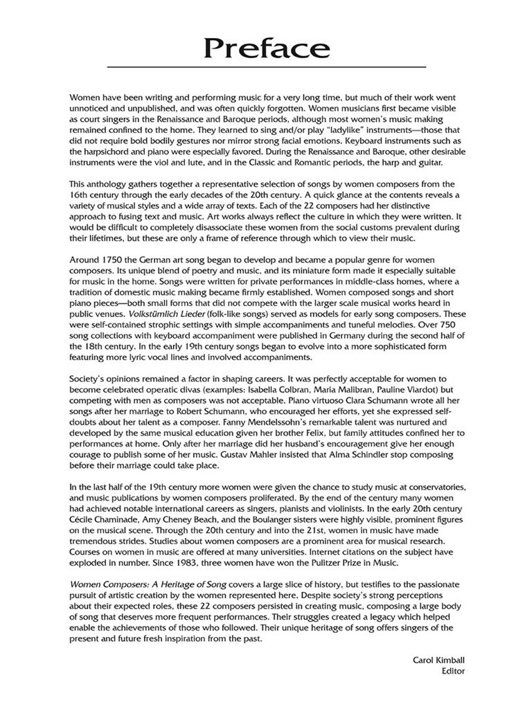 With 45 songs by 22 composers, this is the most comprehensive single volume of art songs composed by women ever published. It includes biographical information about the composers and historical information about each song, with songs in English, French, German and Italian.
