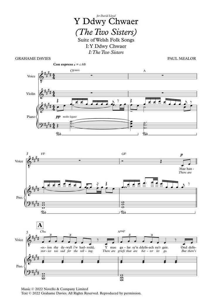 Y Ddwy Chwaer is a suite of Welsh Folk Songs for voice and chamber ensemble. Mealor encourages the performer to take the score as a starting point and to use varying instrumentation and additions to 'make the music their own'. The suite was comissioned as part of the 'Rediscovering Ancient Connections' project which links St. David and St. Aidan of Ferns, County Wexford.